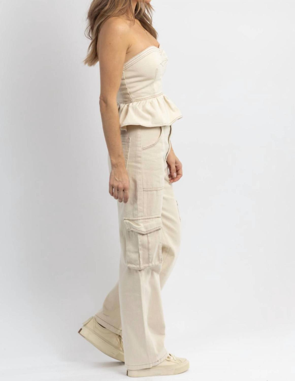 Идеальное сочетание авангардного стиля и шикарного комфорта. Потрясающий комплект из двух предметов. Изготовлен из 100% высококачественного хлопка в универсальном бежевом оттенке. Состоит из корсетного топа с баской и брюк-карго из денима. Безбретельки добавляют нотку очарования. Джинсовая ткань обеспечивает прочность и изысканный вид. Прекрасно иллюстрирует безупречную посадку и модную привлекательность этого комплекта.