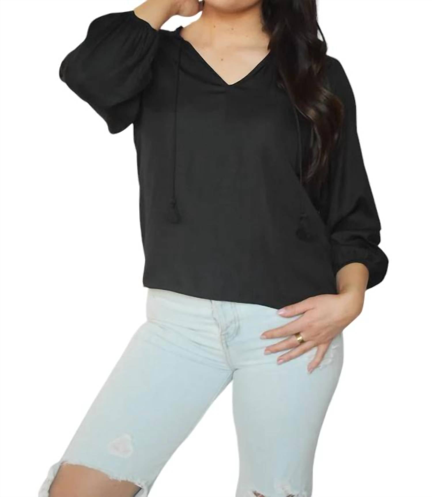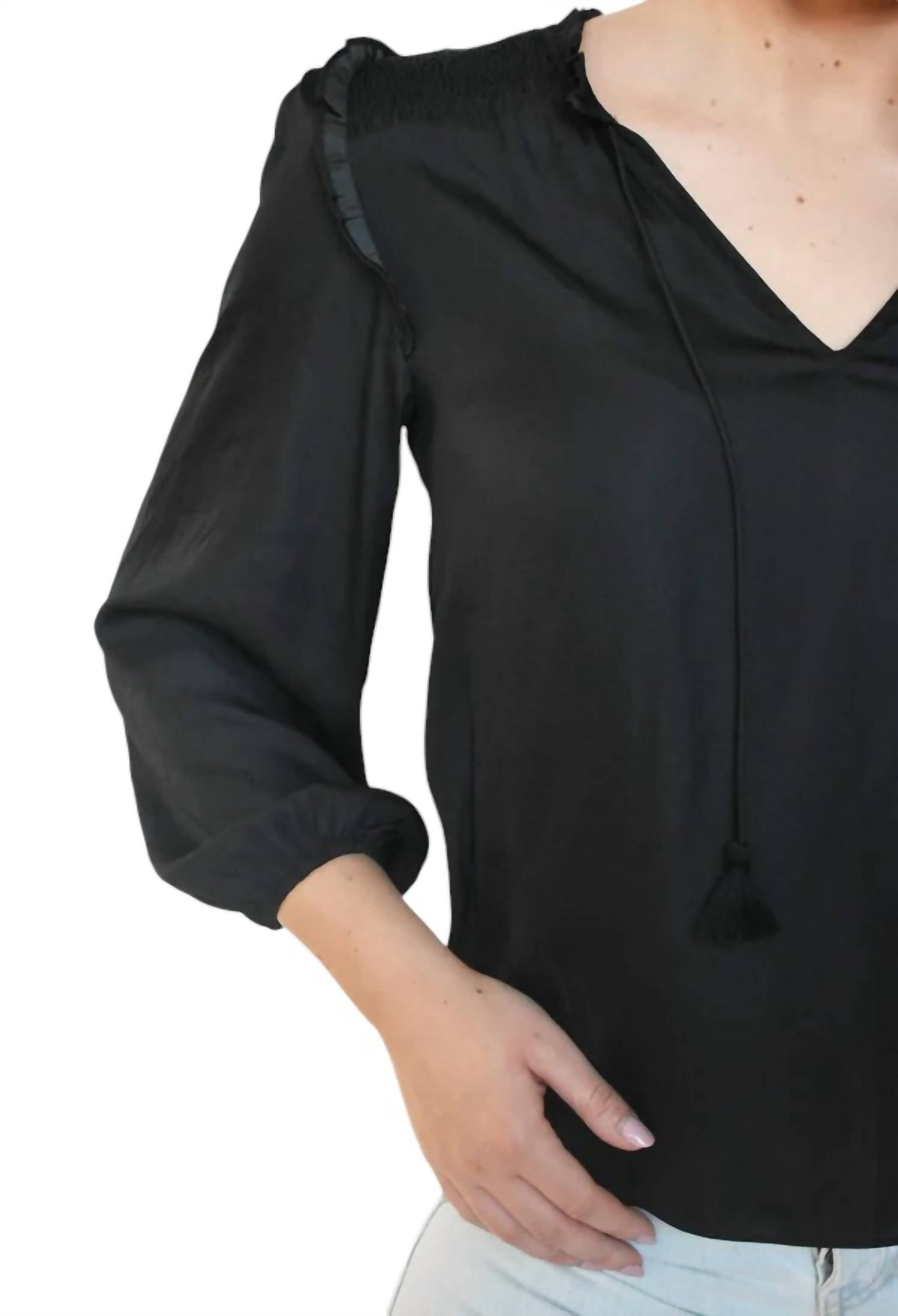 Эта атласная блузка с кисточками и присборенными плечевыми деталями, с V-образным вырезом и рукавами 3/4. Длина маленького размера составляет 24", и она изготовлена из 100% полиэстера.