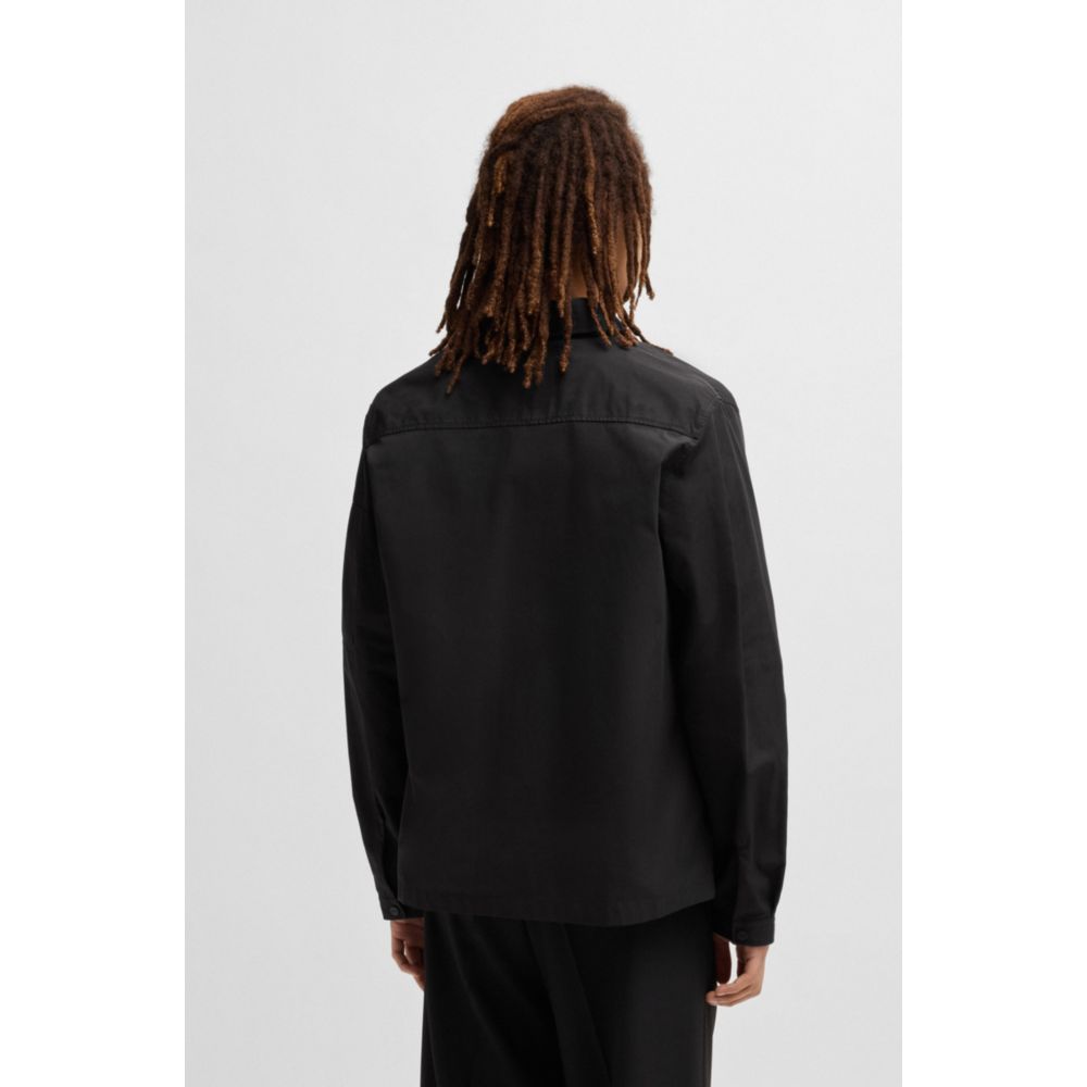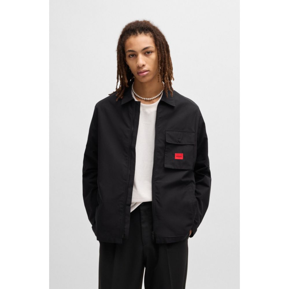 Трендовая рубашка на молнии от HUGO Menswear из парусины с высоким содержанием хлопка, с карманом на молнии на рукаве и красной этикеткой с логотипом.