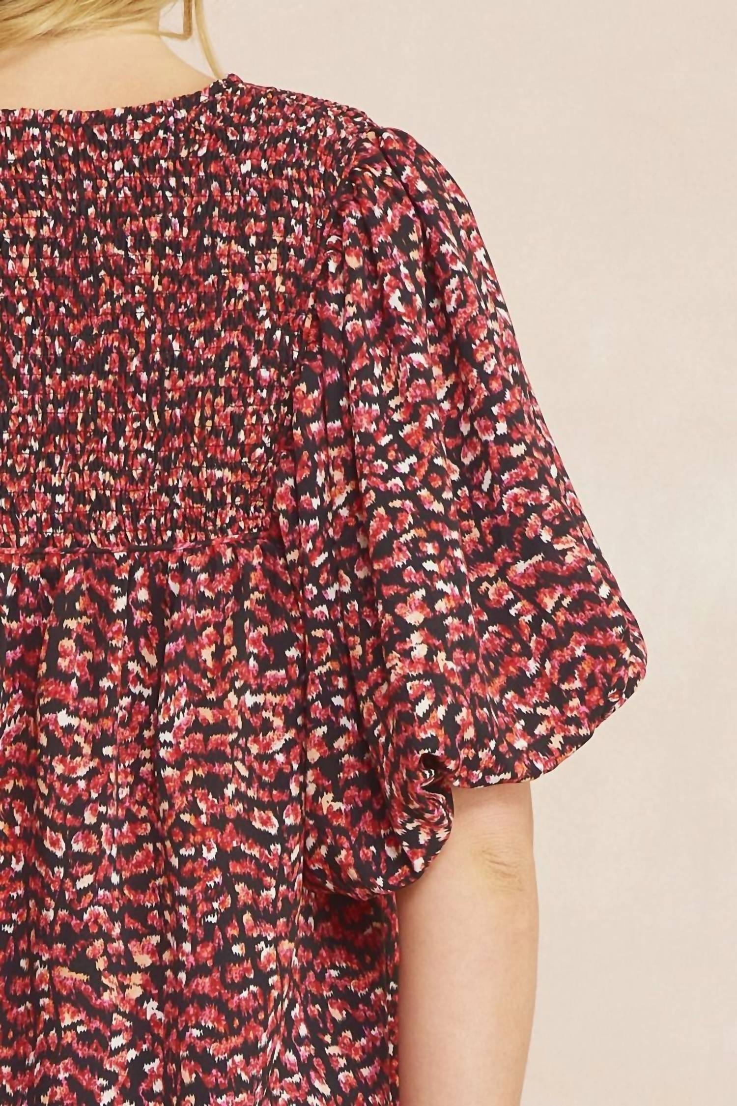 Короткий рукав-фонарик. Присборенные плечи. V-образный вырез. Завязывающаяся застежка. Свободный лиф. Тканый. Непрозрачный. Легкий. Соответствует размеру. 100% полиэстер