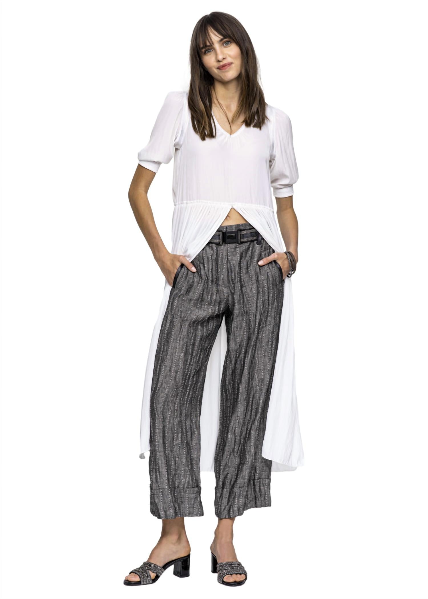 Укороченная длина. Боковые карманы. Ткань - 100% лен/90% полиэстер 10% эластан/52% полиэстер 48% вискоза. Сделано в Германии.