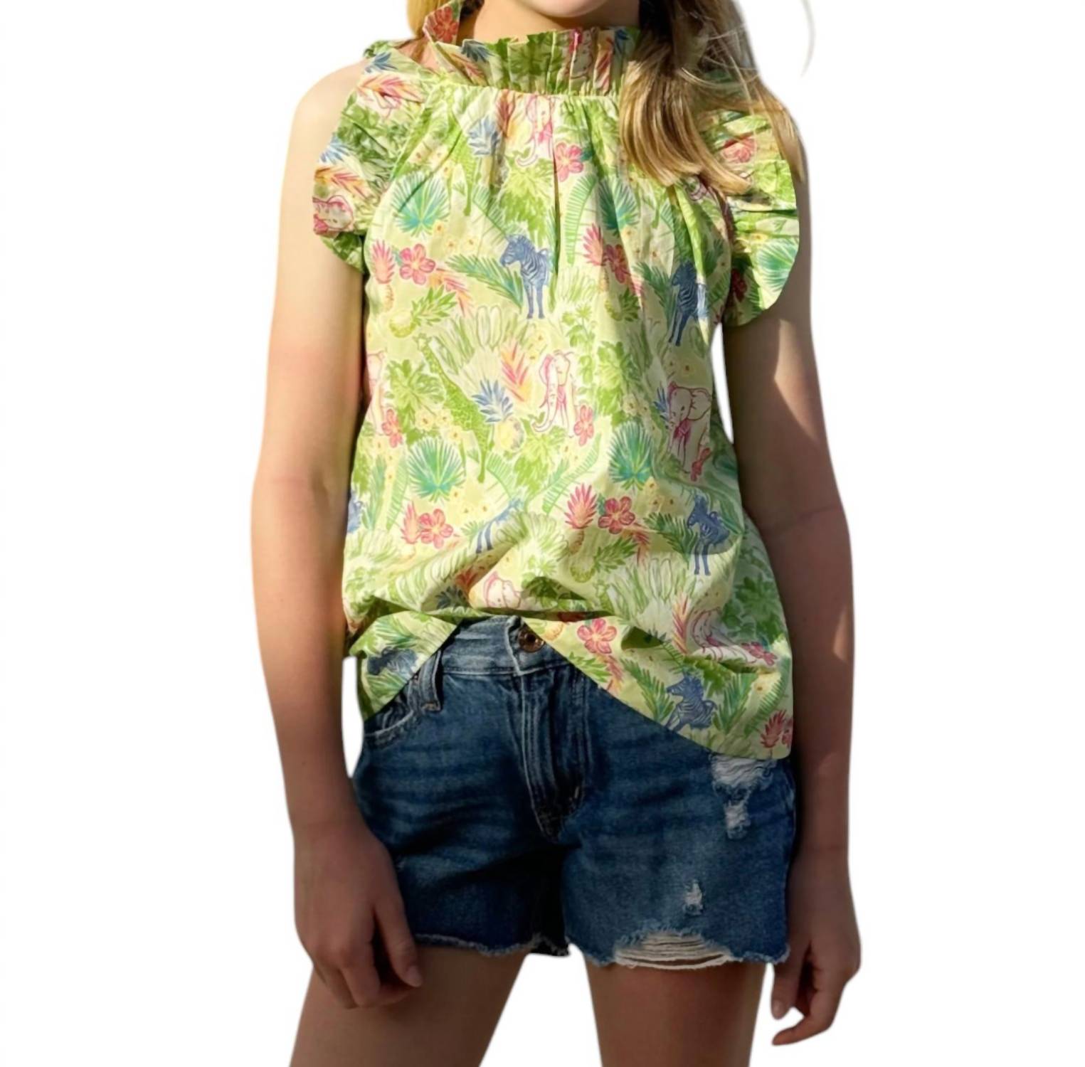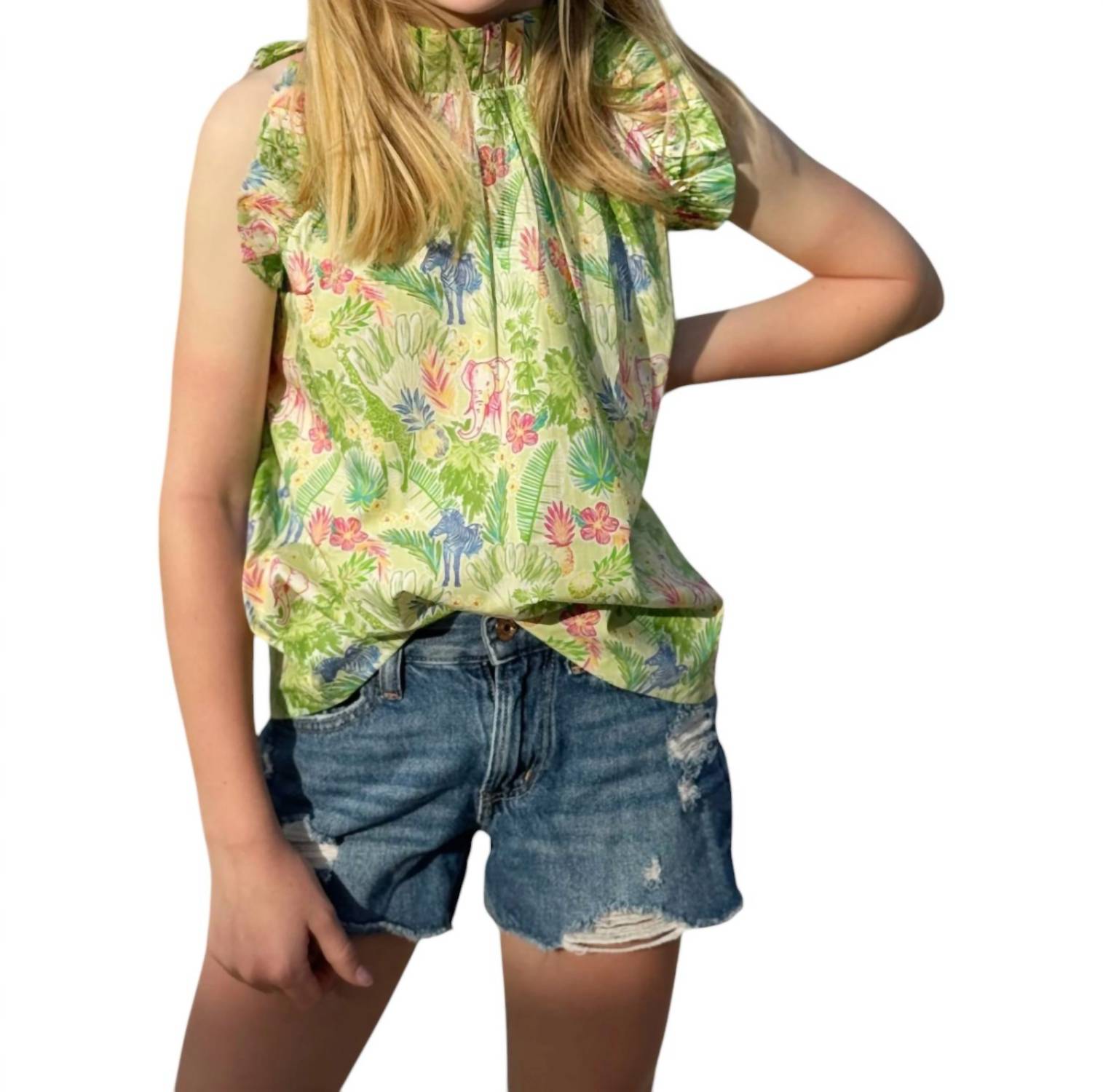 Очаровательная и очаровательная блузка. Имеет оборки вокруг воротника и короткие рукава. Изготовлена из 100% роскошного хлопка. Обеспечивает комфорт и стиль с восхитительным зеленым рисунком животных. Застежка на пуговицы сзади обеспечивает легкость надевания. Рекомендуется машинная стирка в холодной воде и машинная сушка без нагрева, чтобы сохранить наилучший вид.