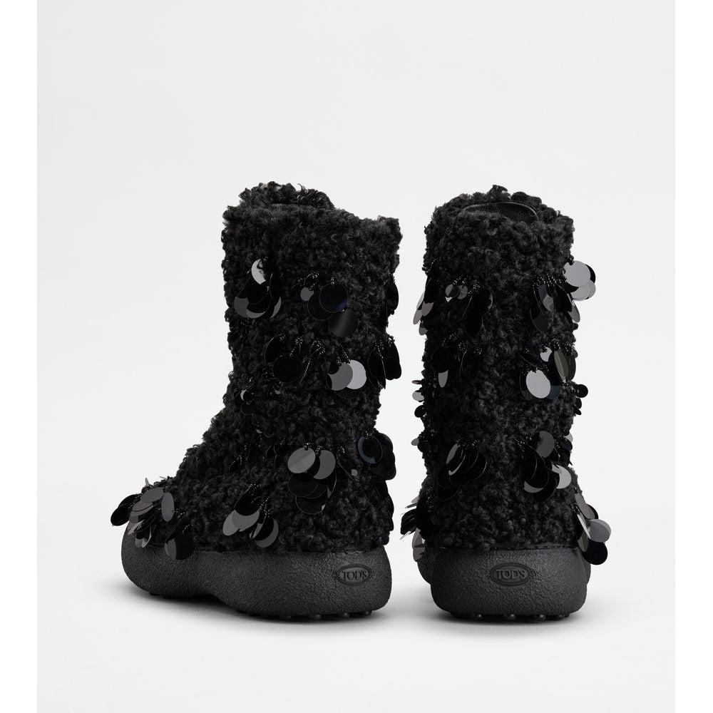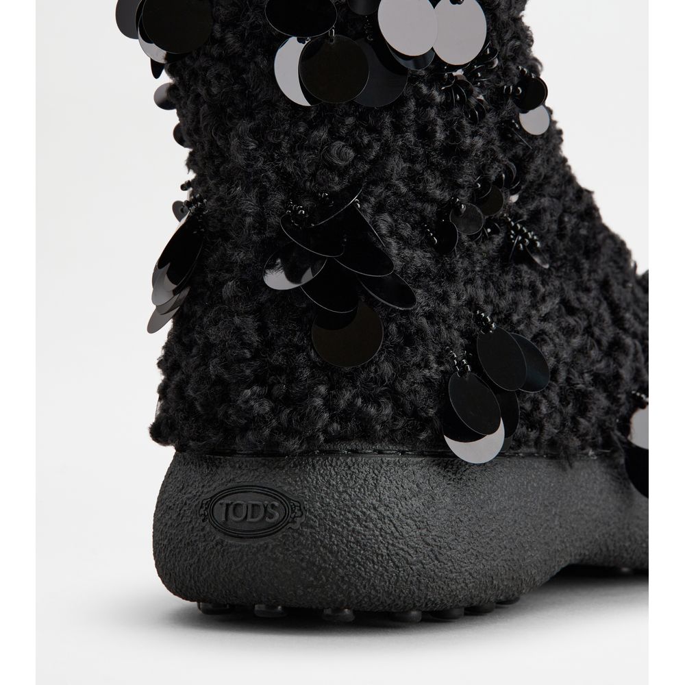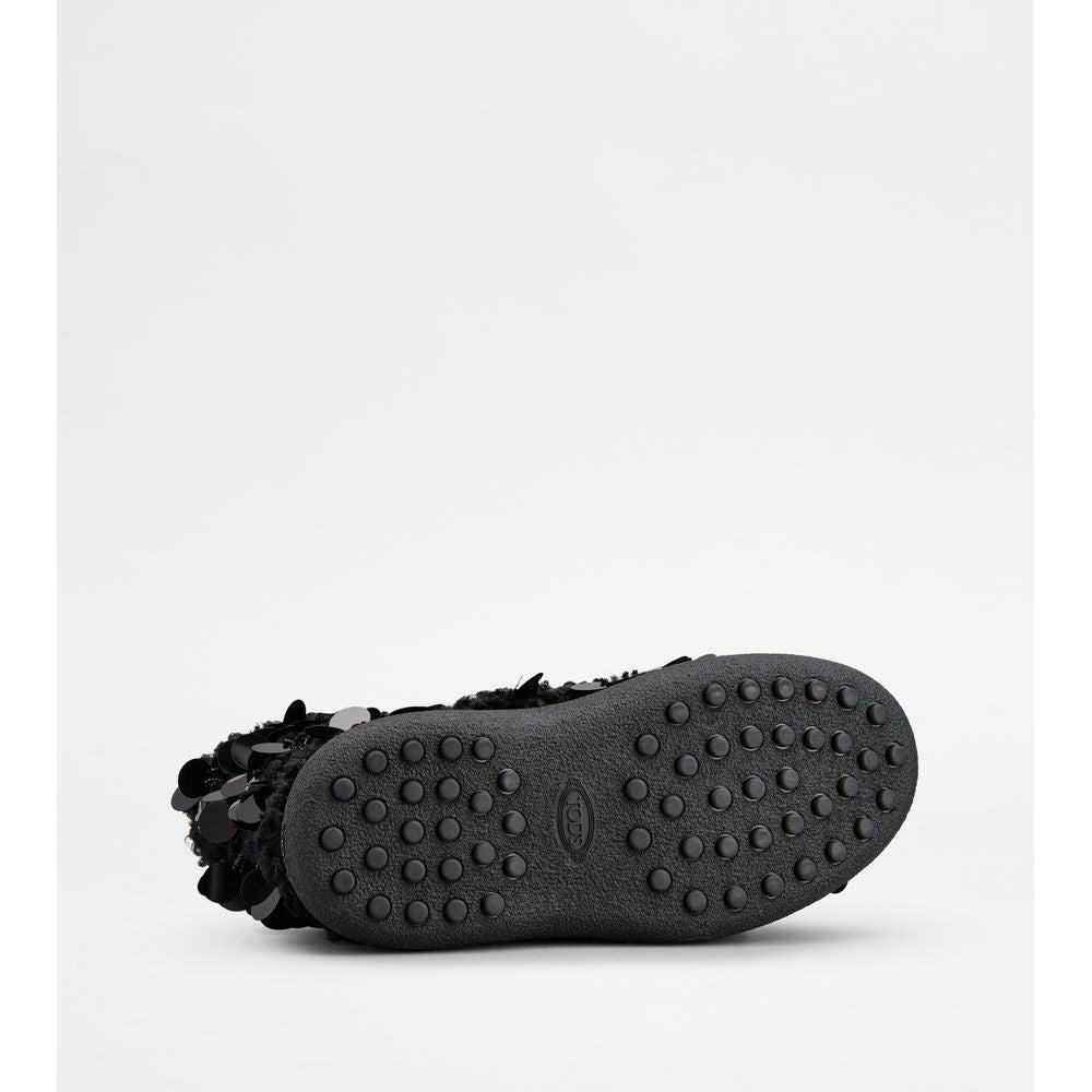 Характеризующийся массивной, но строгой и изысканной подошвой, стиль Tod's WG представлен здесь в версии ботильонов на шнуровке с гламурным оттенком. Сделанные из искусственного меха со стразами по всей поверхности и крупными пайетками, они поставляются с культовой резиновой подошвой в виде гальки.