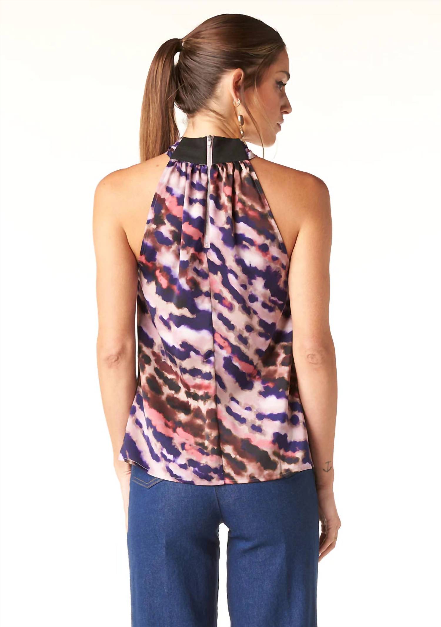 Топ из поли-сатина с халтером и перекрученной горловиной. На модели размер XS.