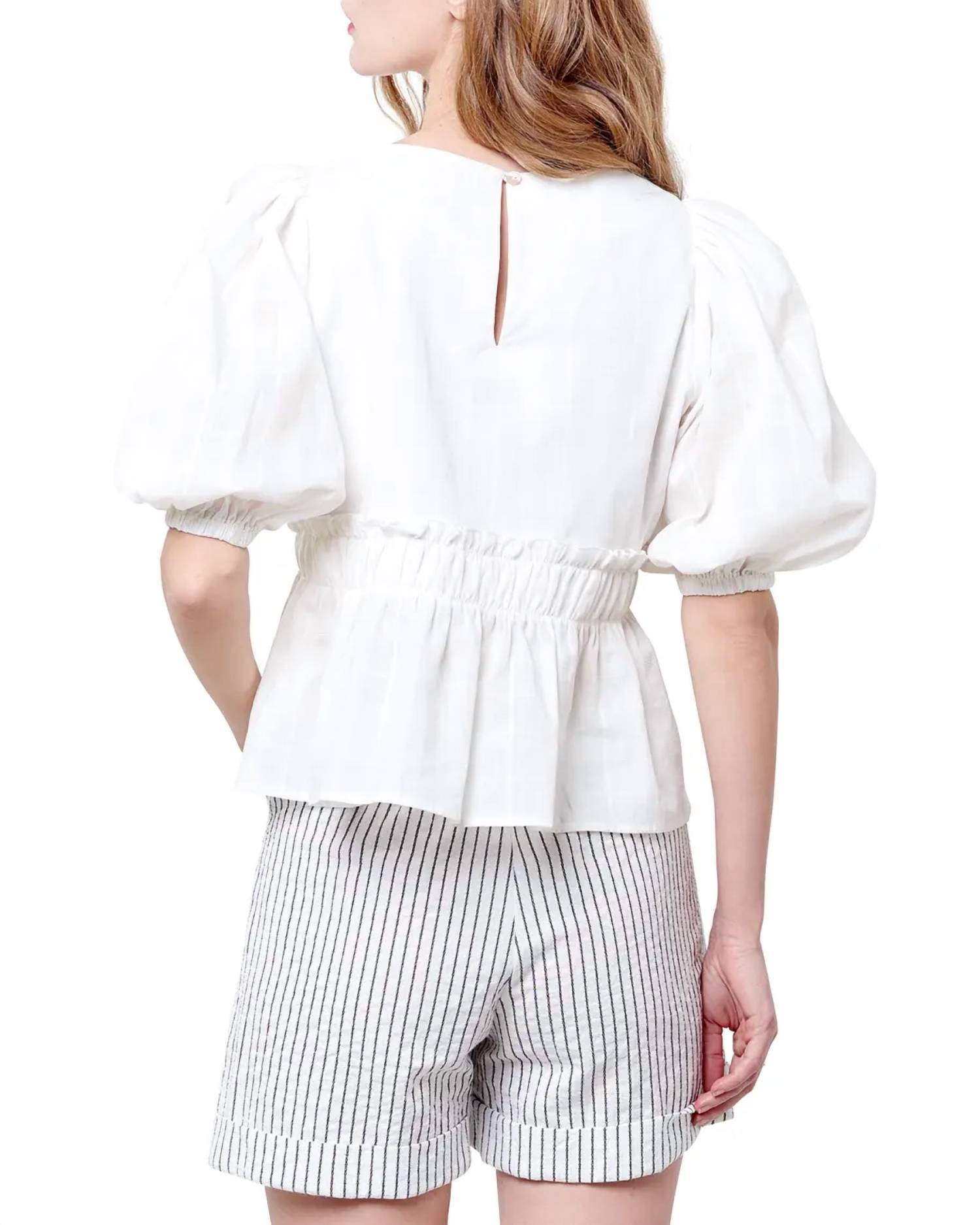 Универсальная блузка, которая подойдет и для работы, и для ужина! Имеет оборчатую баску и рукава-фонарики для игривого, стильного образа. Свободная посадка и соответствие размеру, она обеспечивает непринужденный силуэт. Изготовлена ​​из 100% хлопка, она удобная и дышащая. Длина 22 дюйма для размера Small.