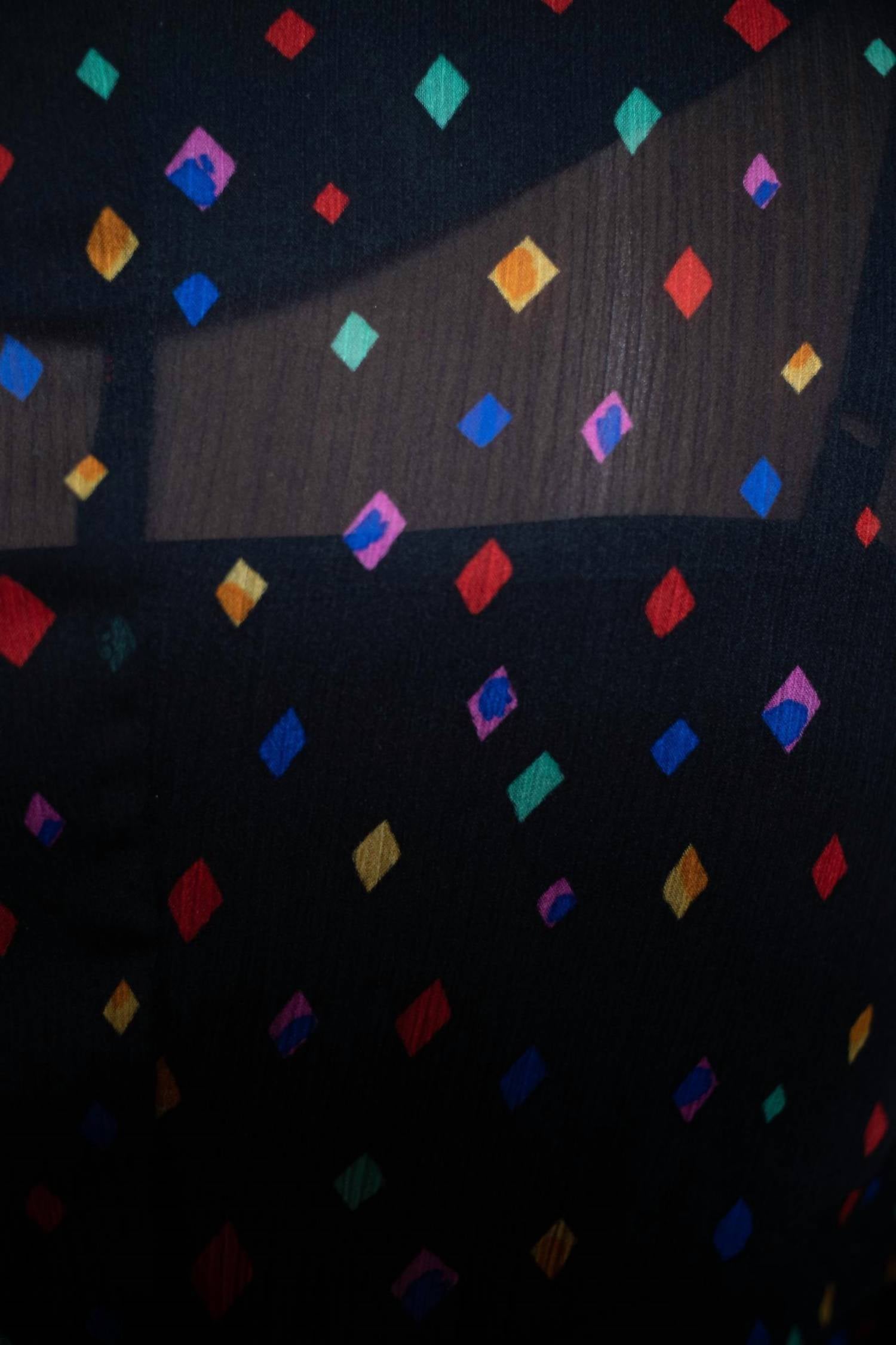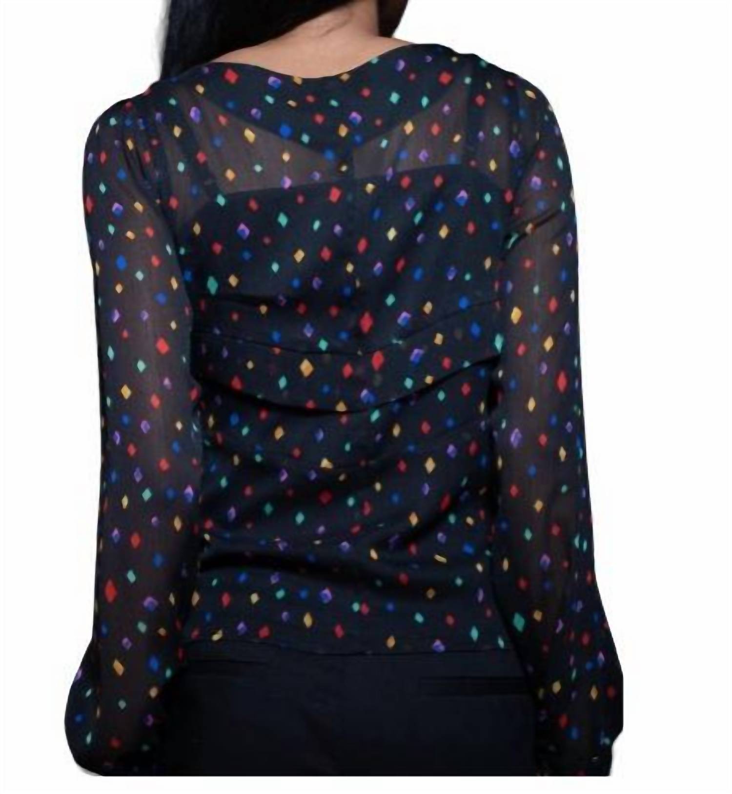 Застежка на пуговицы спереди. Плиссированный бант спереди. Длинные рукава. Жатый шифон черного цвета, покрытый бриллиантами цвета драгоценных камней. В комплекте с черной майкой на тонких бретельках. Химчистка. 100% полиэстер. Сделано в Лос-Анджелесе, США.