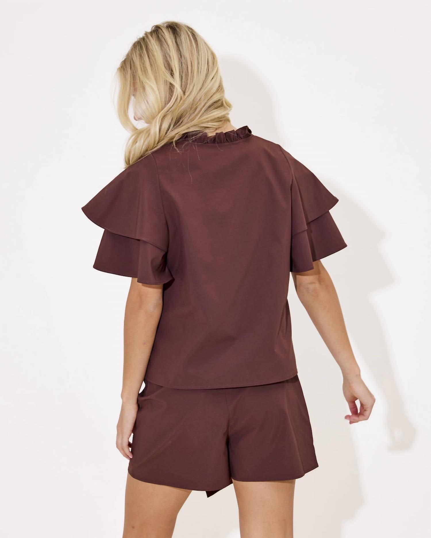 Короткие многослойные рукава, V-образный вырез и игривый воротник-стойка с оборками делают его ярким и стильным переходным изделием. 100% полиэстер. Надевается на голову. Машинная стирка в холодной воде, машинная сушка при низкой температуре. На модели размер XS.