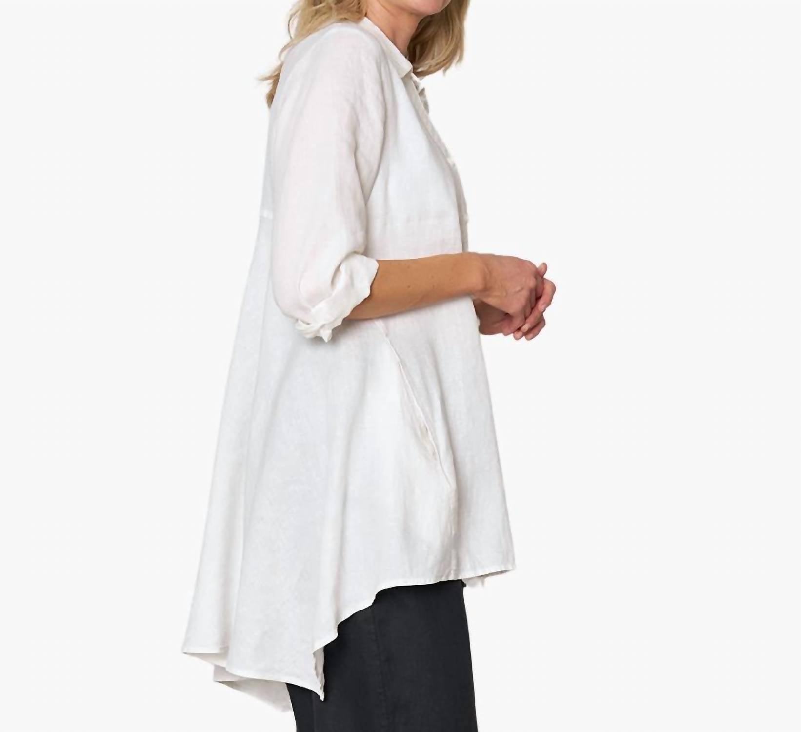 Косой крой вставок. V-образный вырез и удобный А-силуэт. Карманы в швах и уникальная форма подола. Длина по спинке составляет приблизительно 31 дюйм для размера S. Модель выше ростом 5 футов 11 дюймов носит размер S. 100% лен. Импортный. Машинная стирка.