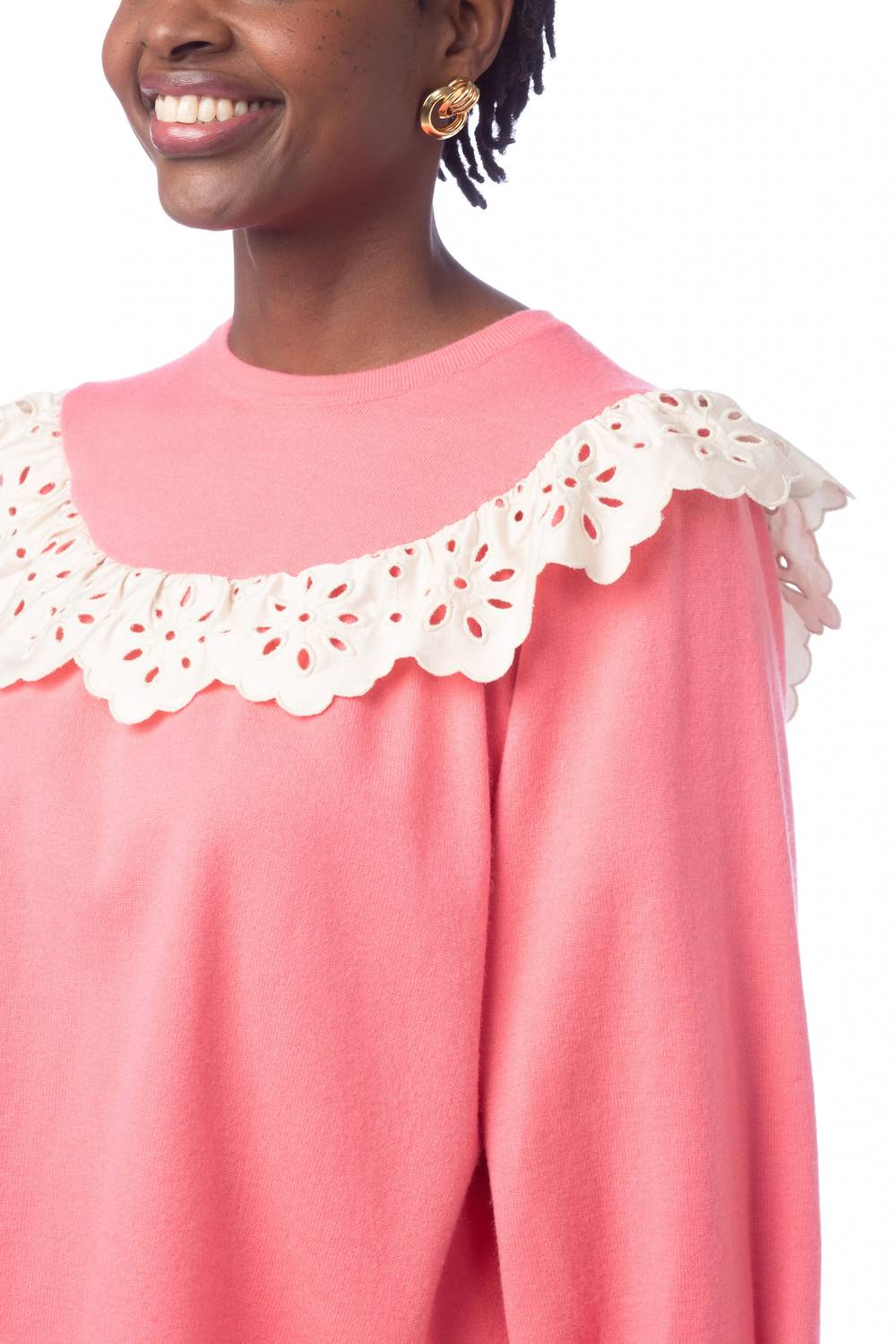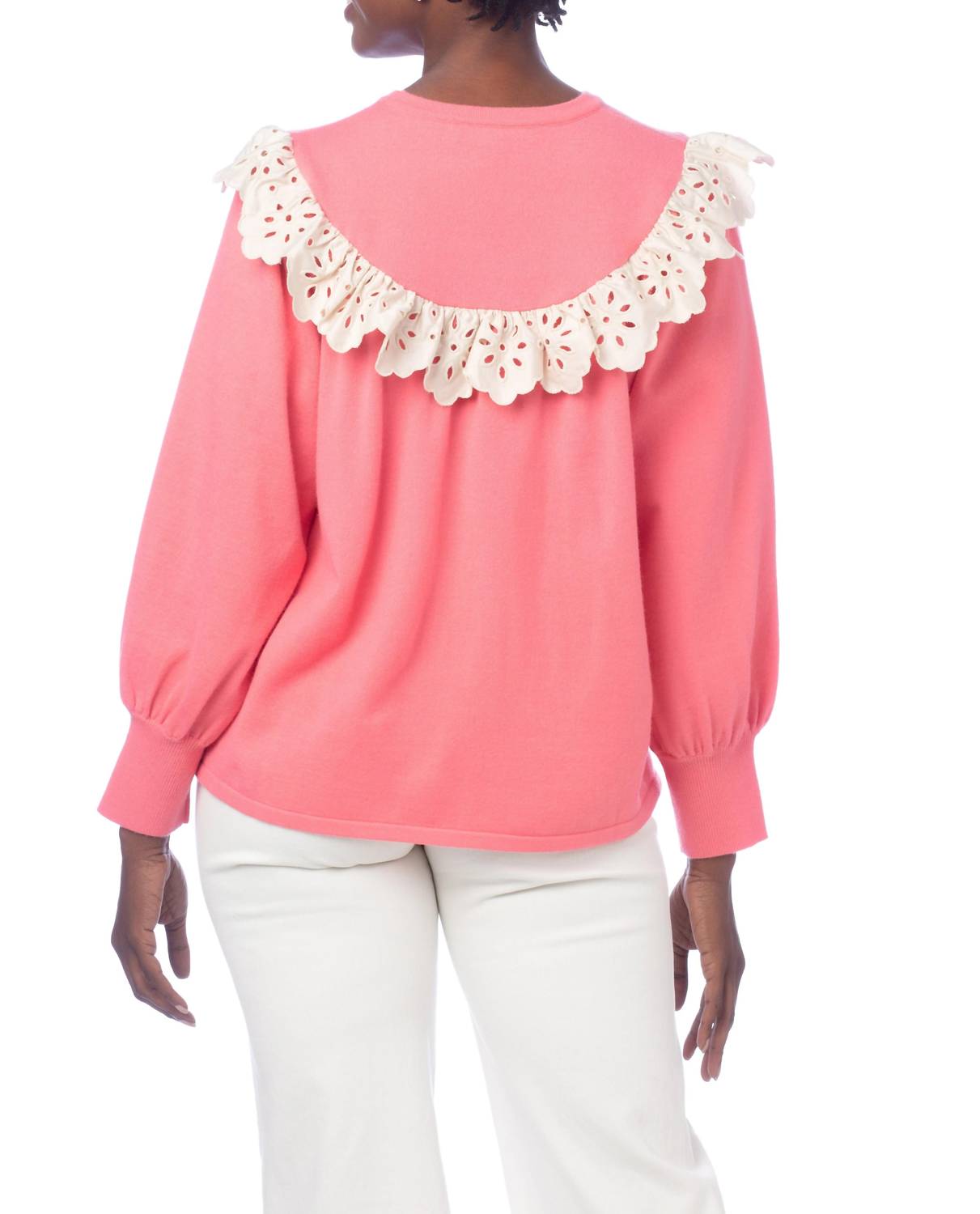 Свитер трикотажный. Круглый вырез. Длинные рукава. Вышитая ажурная тесьма и трикотажные манжеты. Ручная стирка (предпочтительно), машинная стирка.