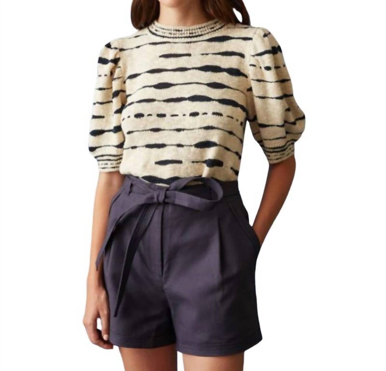 Приталенный фасон с высокой талией, завязывающимся поясом, складками спереди и боковыми карманами.