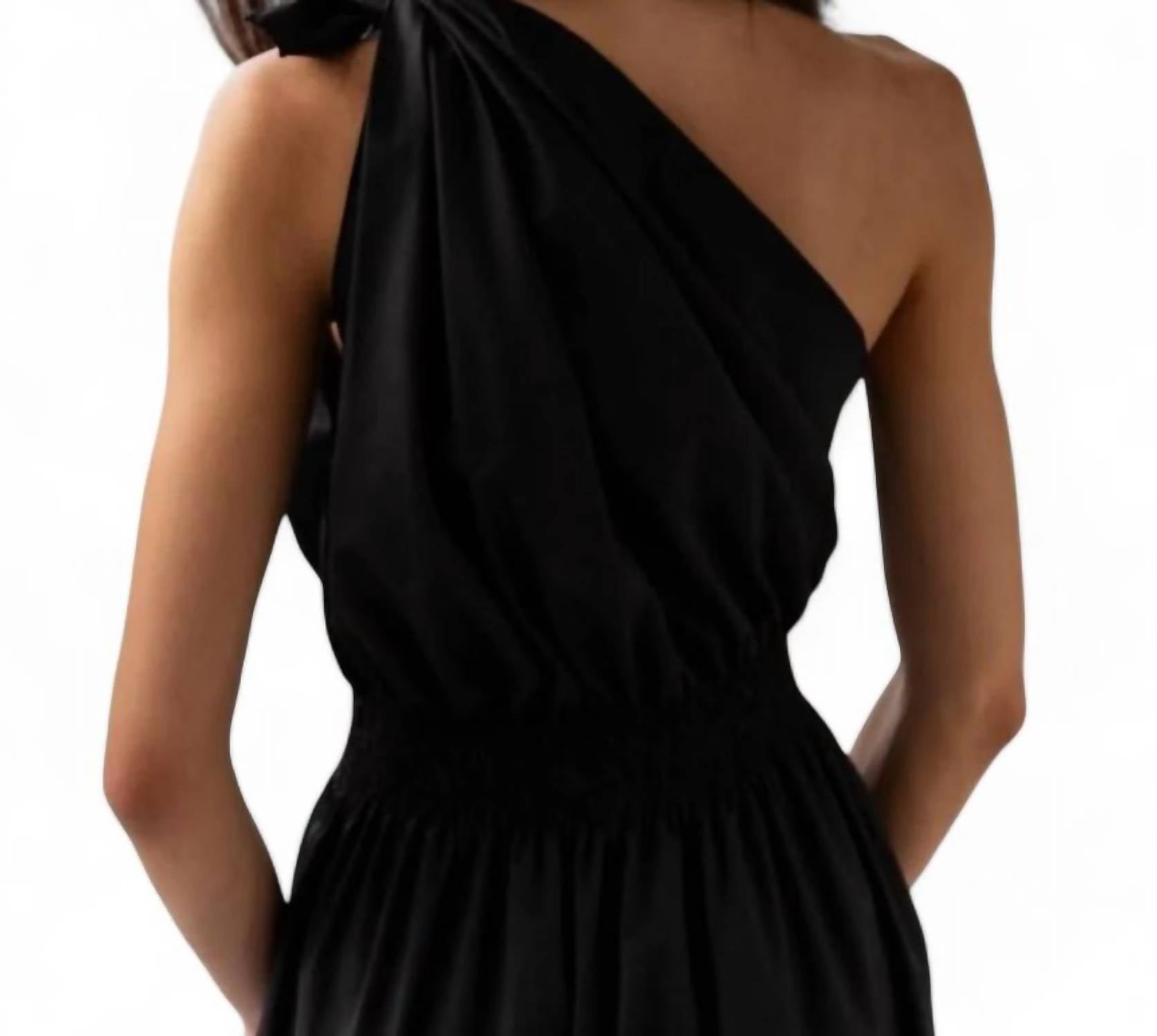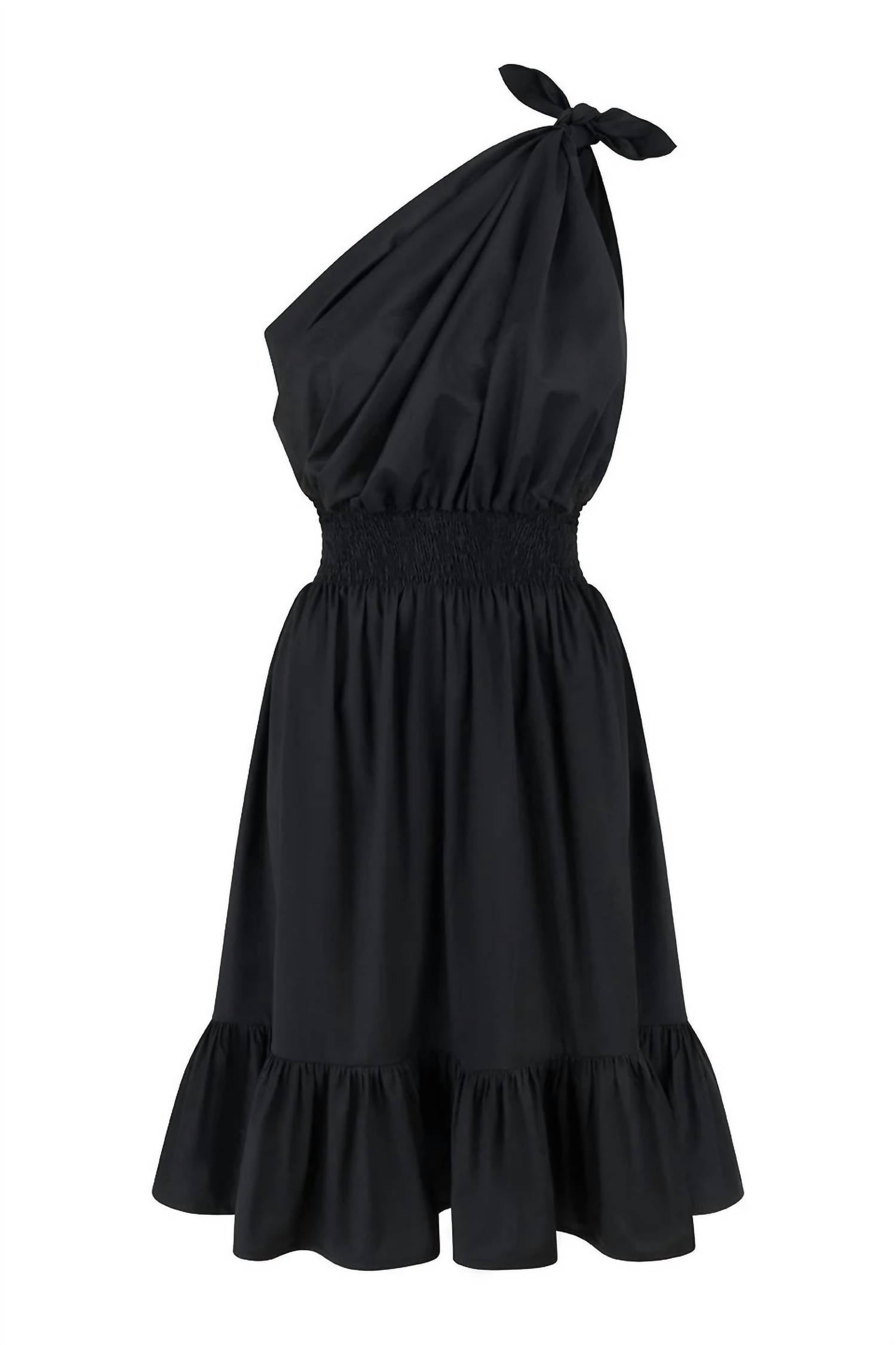 Это платье имеет асимметричный вырез халтер с оборками по подолу. У него эластичный пояс, который создает оборки на груди и по направлению к подолу, а также узел на левом плече. Изготовлено из 97% эко-хлопка и 3% эластана. Машинная стирка при максимальной температуре 40 градусов.