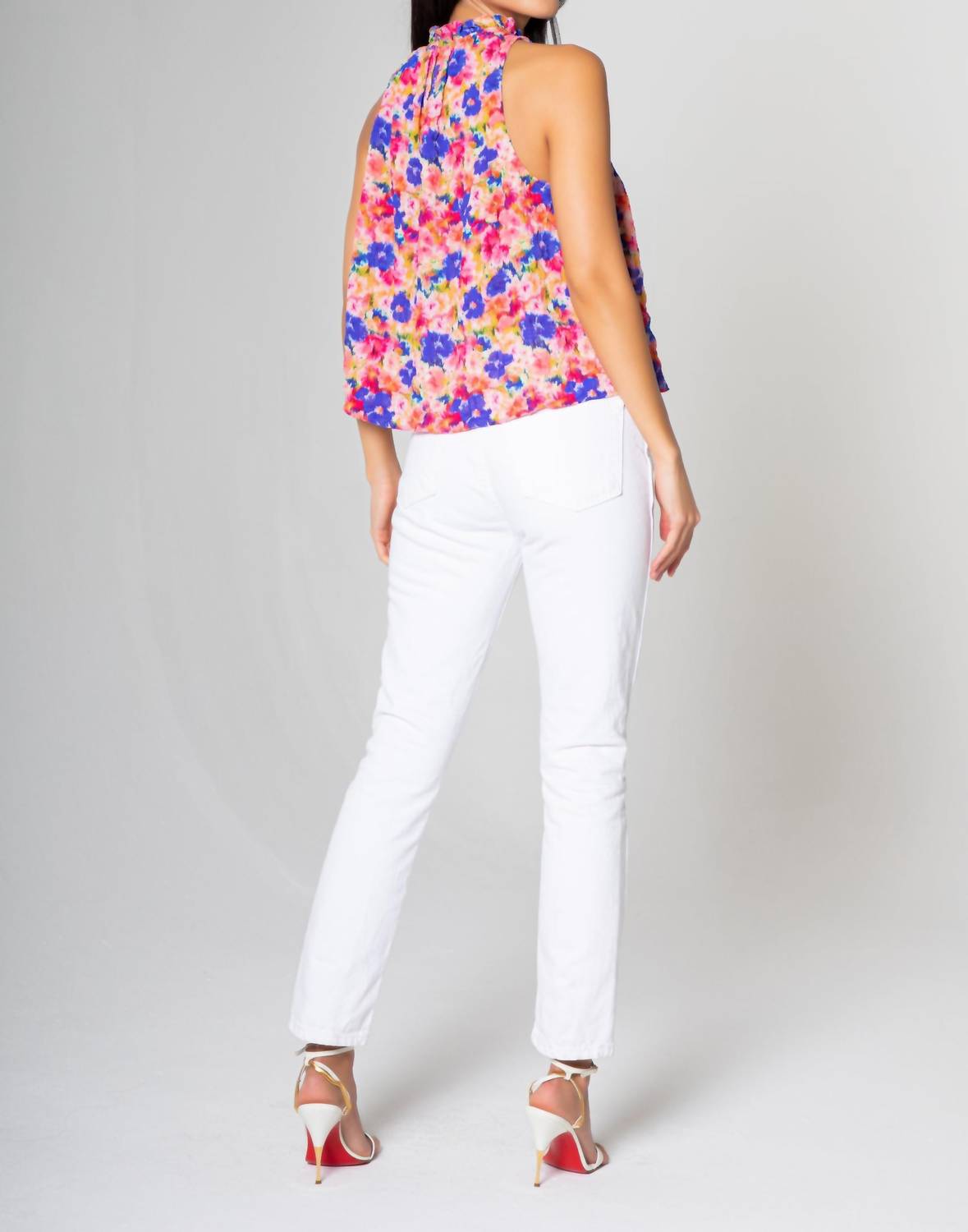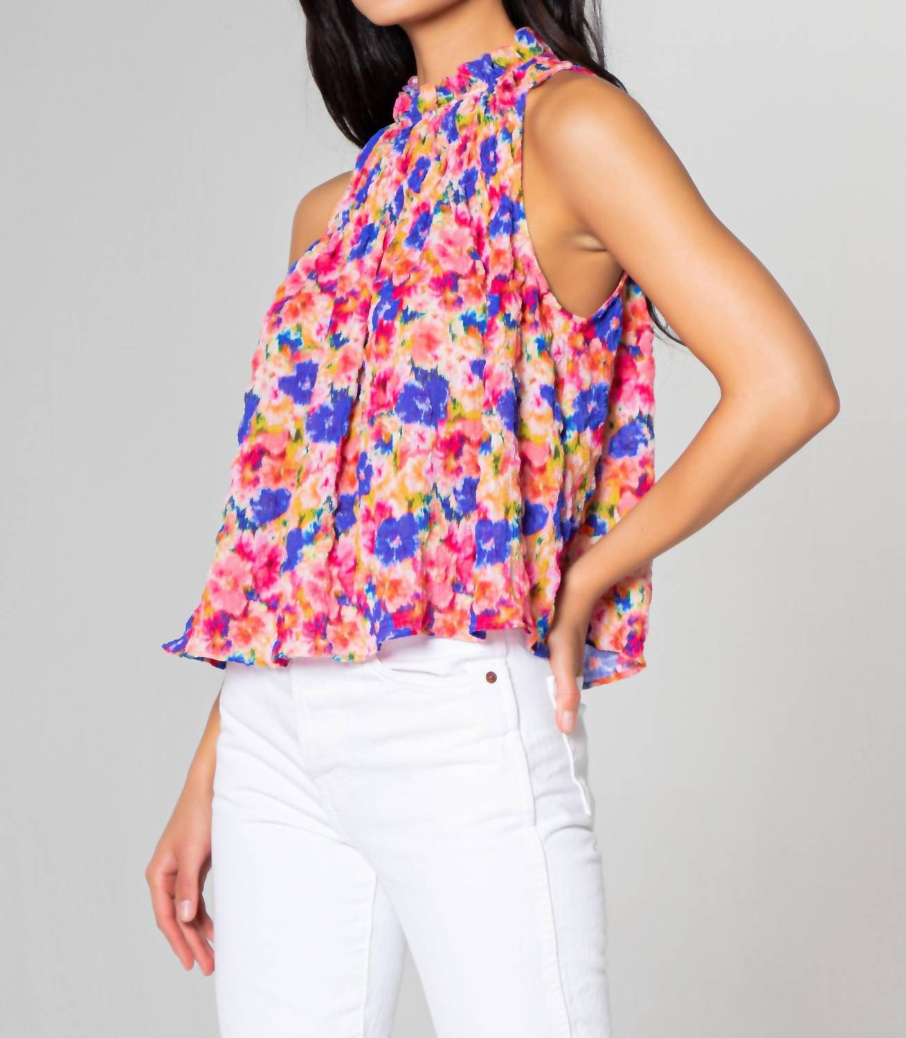 Украсьте свой гардероб этим топом без рукавов, выполненным из воздушного шифона с гофрированным цветочным принтом. Изящный гофрированный вырез добавляет нотку романтики, а легкая ткань красиво драпируется для непринужденного женственного образа. Этот топ идеально подходит для многослойного ношения или ношения отдельно, это универсальный выбор для любого случая. Химчистка. 98% полиэстер, 2% Ea.