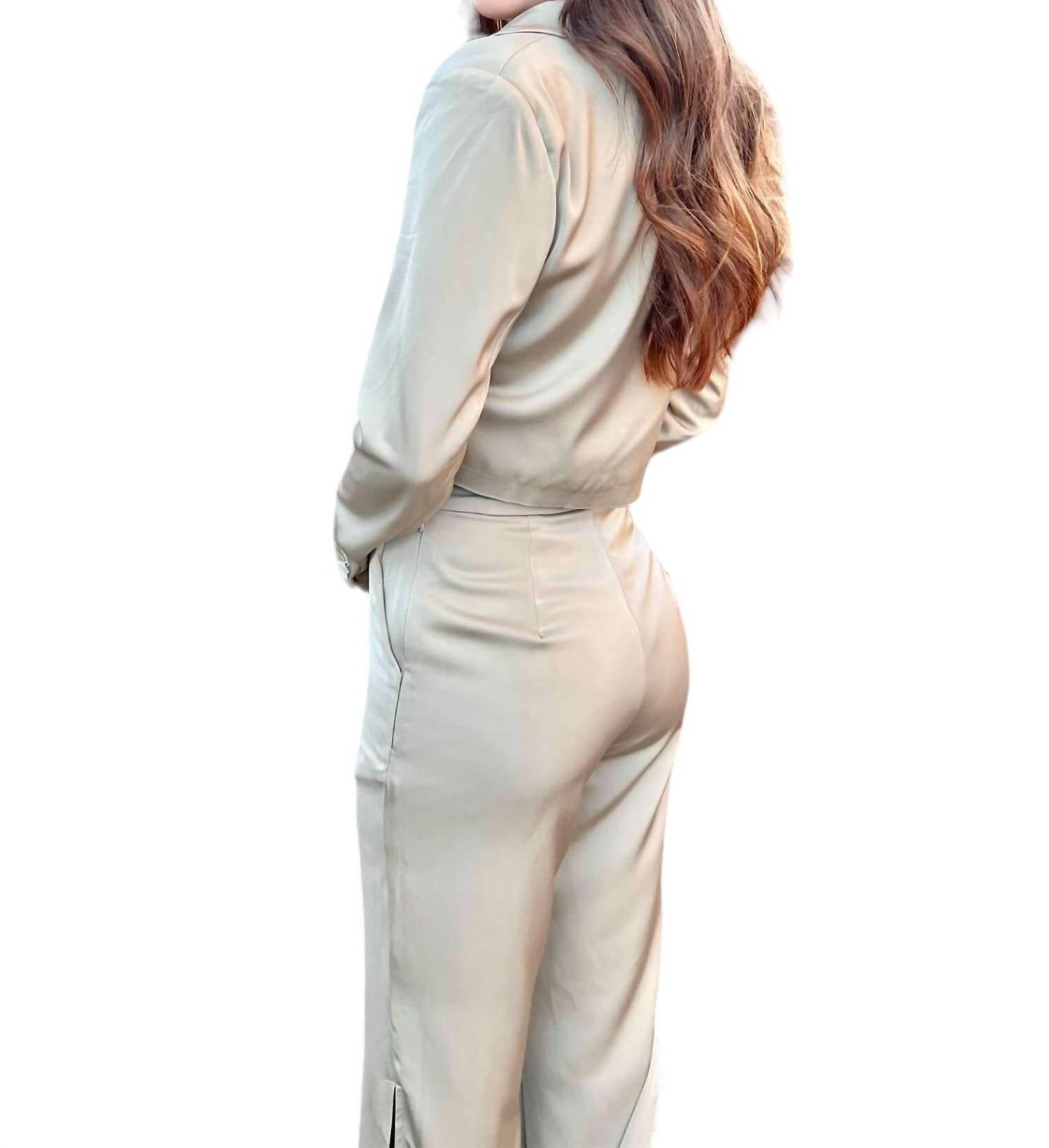 Этот комплект из блейзера и брюк выполнен из атласной ткани. Укороченный комплект из блейзера и длинных брюк. Вырезной воротник. Длинный рукав с манжетой на пуговицах. Прямые брюки. Застежка-молния сбоку с застежкой на пуговицы. Разрез сбоку на подоле. На подкладке. Рост Мэгги 5 футов 7 дюймов, обхват груди 32B; обхват талии 24-25 дюймов; размер XS-S. На ней размер XS. Соответствует размеру.