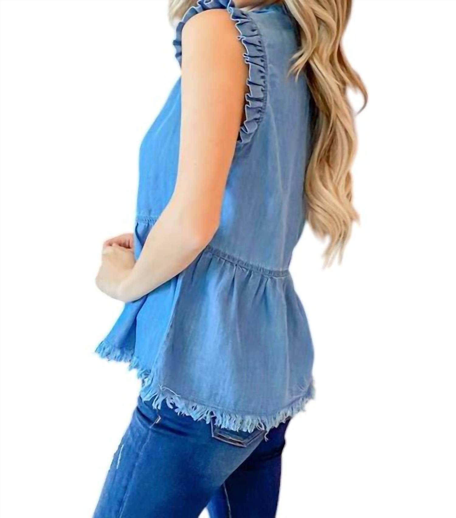 Этот топ имеет рукава с оборками, защипы на шее, бахрому на подоле и вырез-замочную скважину на спине. Изготовлен из 95% полиэстера и 5% спандекса.