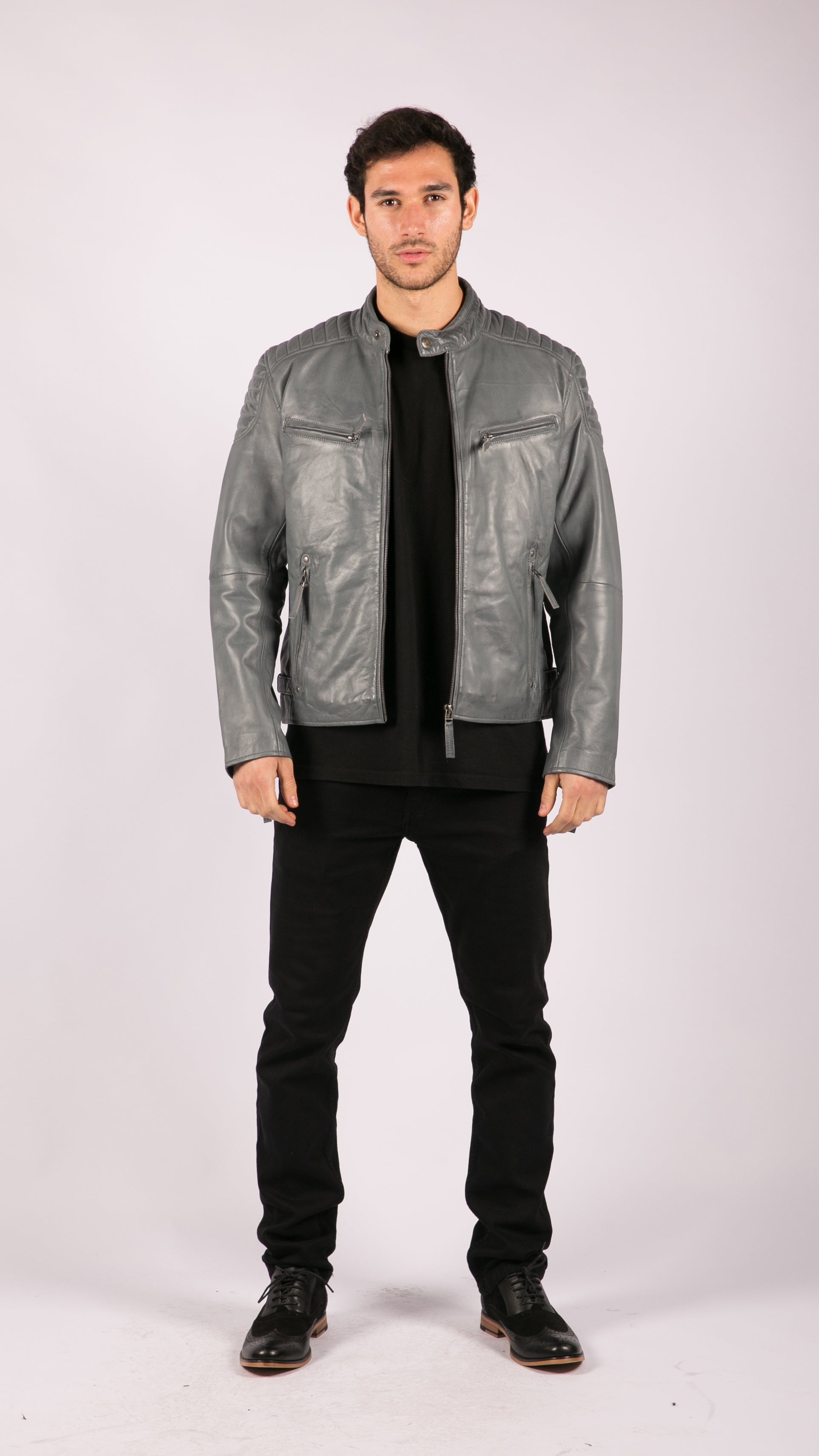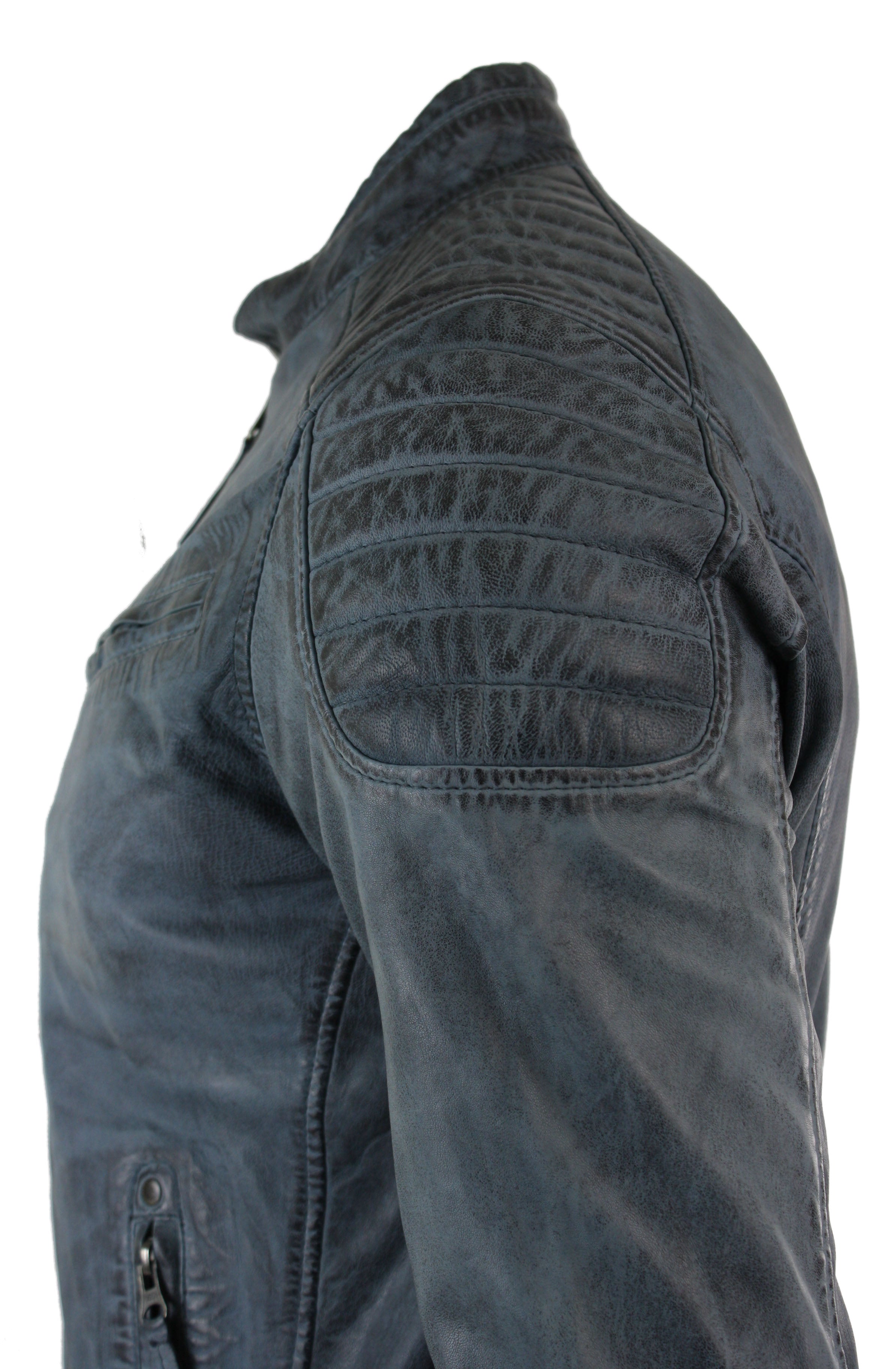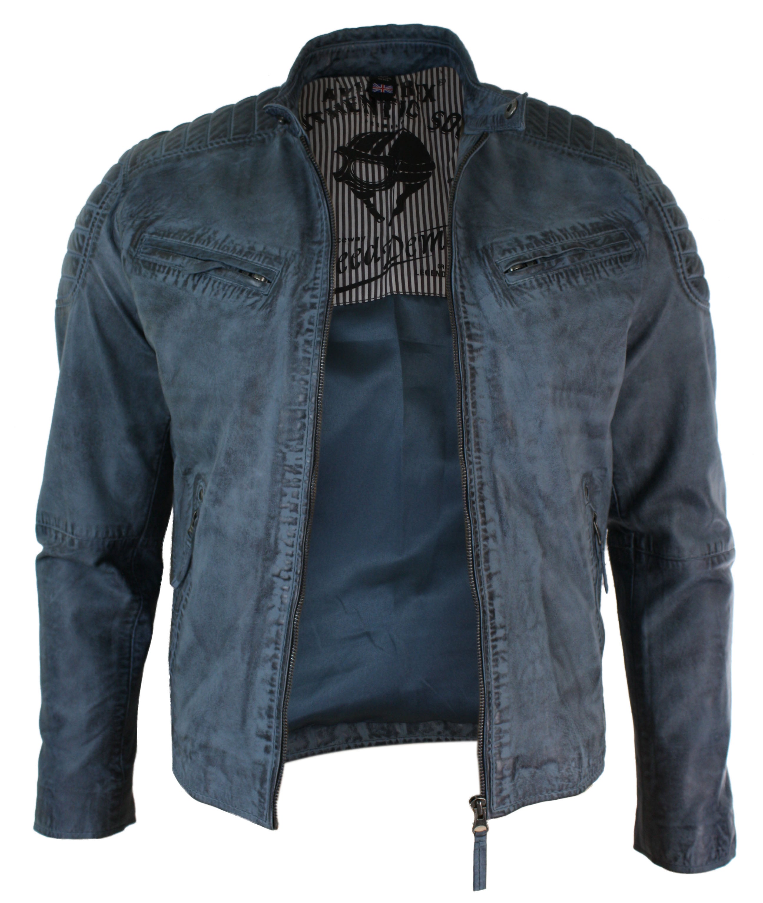 * Мужская стиранная куртка из высококачественной байкерской кожи на молнии * Отделка плечевыми швами, стиранная двухцветная сине-серая кожа в стиле ретро * Куртка на молнии с 4 передними карманами на молнии и внутренними карманами * Приталенный крой **Для более классической посадки выбирайте на 1 размер больше Материал: Внешняя часть: 100% кожа; Подкладка: 100% полиэстер