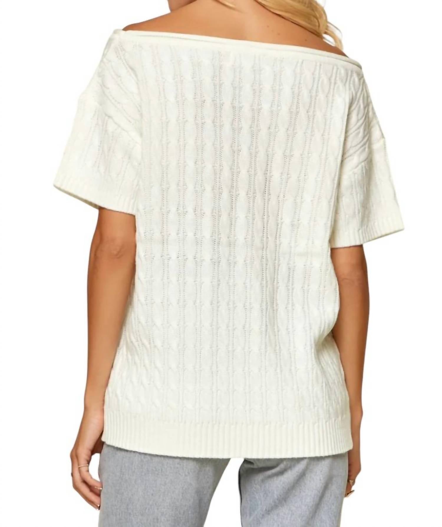 Этот вязаный косами свитер-топ имеет рукава-летучая мышь, короткий рукав и его можно носить на одно плечо. Изготовлен из 100% акрила и разработан как надеваемый.
