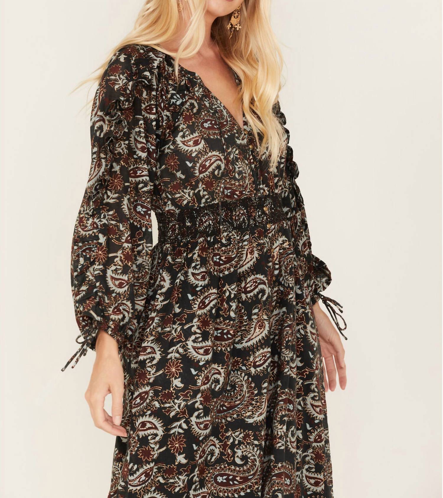 Модель ростом 5 футов 8 1/2 дюйма носит размер small. V-образный вырез с застежкой-завязкой. Длинные рукава с завязками на манжетах. Длина миди. Золотые пуговицы спереди. Присборенная талия. Черный цвет с узором пейсли по всей поверхности. Машинная стирка в холодной воде, сушка в стиральной машине при низкой температуре. Импортный