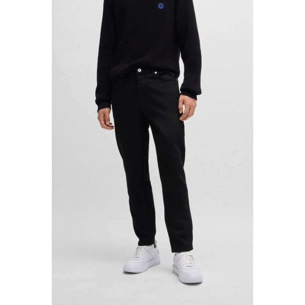 Черные джинсы от HUGO Menswear, сшитые из эластичного денима для удобства движения. Эта пара со стандартной посадкой имеет зауженный крой с фирменной отделкой.