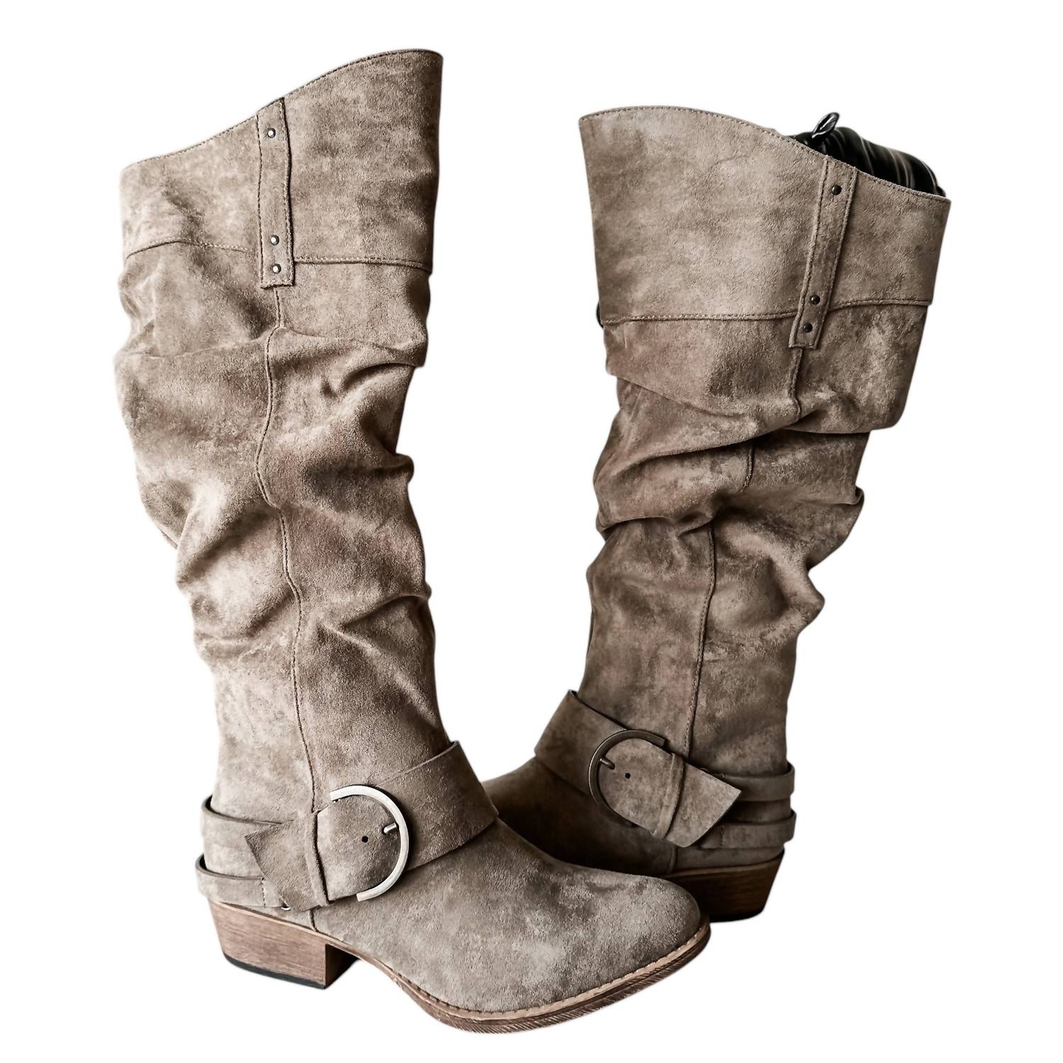 Эти сапоги до колена имеют верх из искусственной замши с боковой молнией для легкого надевания/снимания. Они имеют приблизительно 1,5-дюймовый наборный каблук и пряжку-ремешок для дополнительного стиля. Импортные.