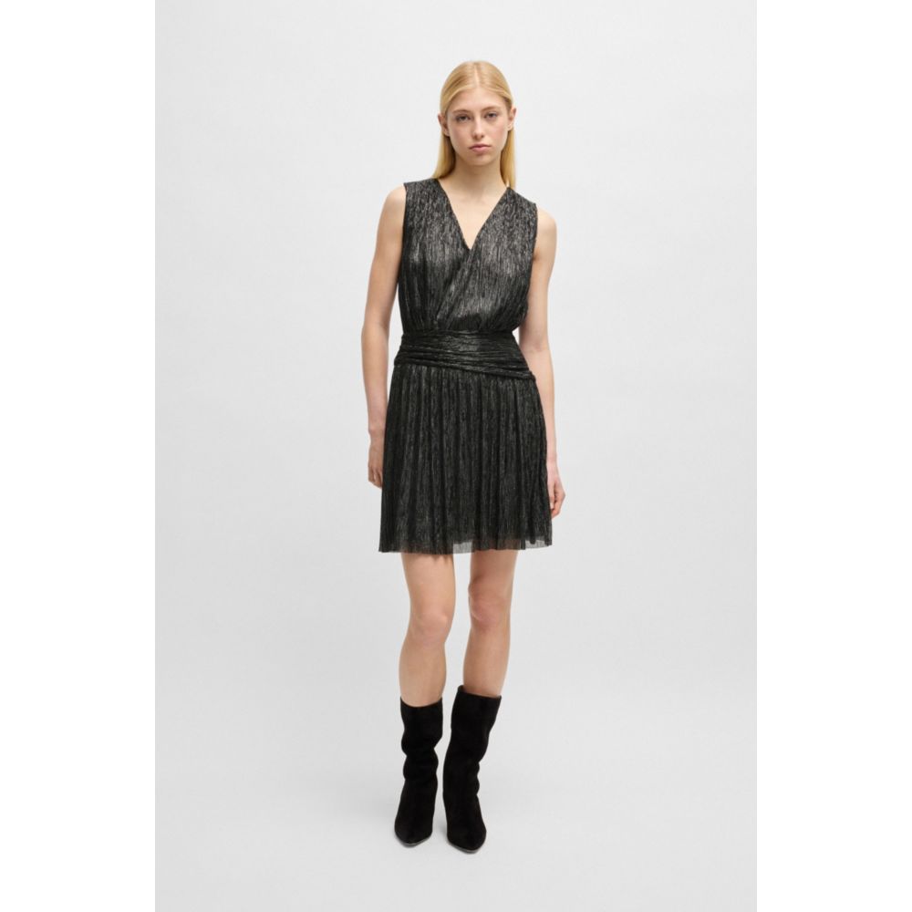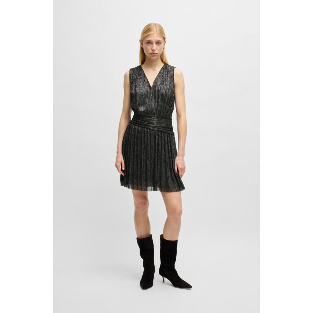 Элегантное платье в плиссированные складки от BOSS Womenswear. С широким передом, без рукавов, с приталенной юбкой и оборкой по подолу.
