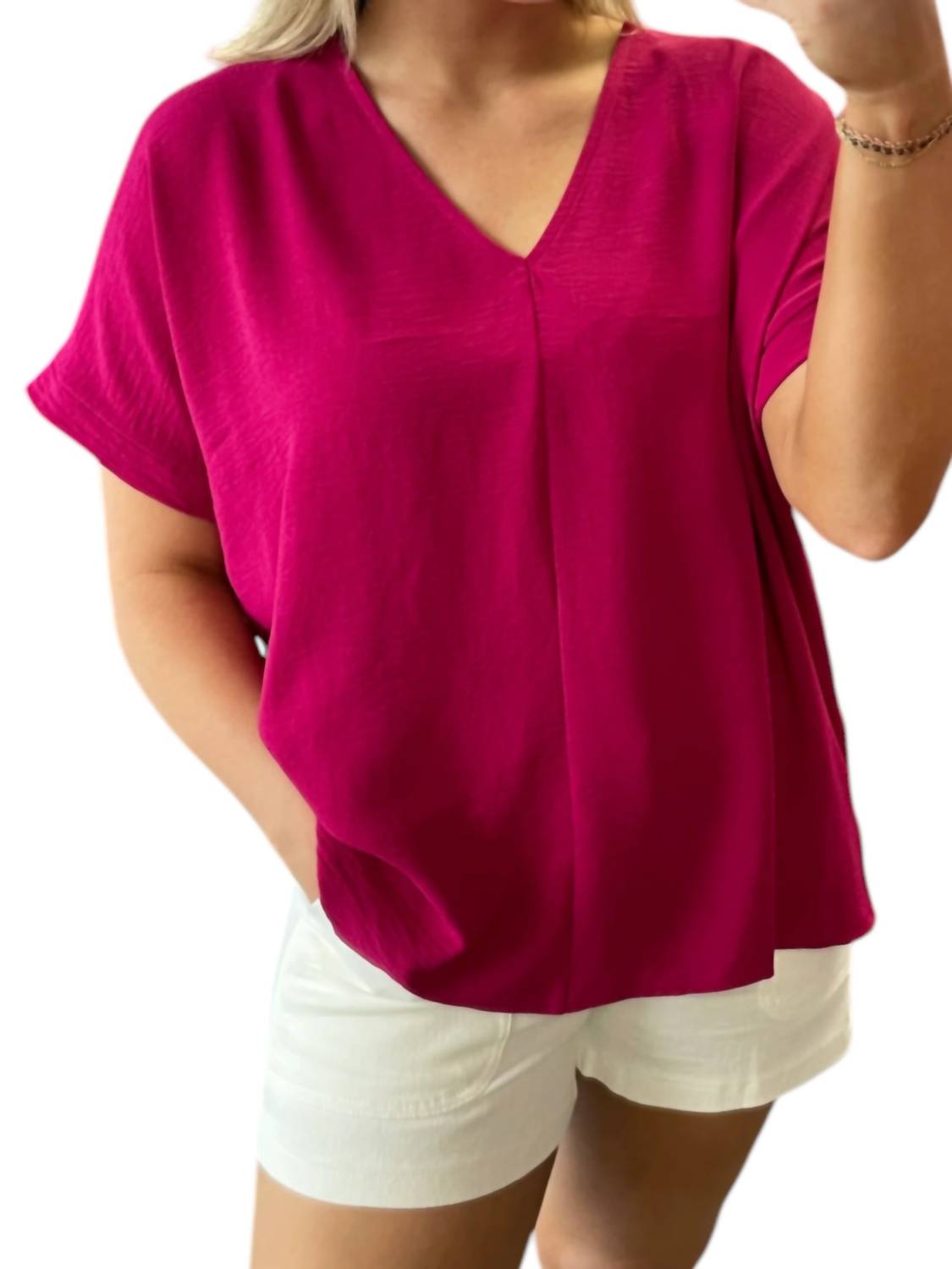 Откройте для себя непринужденный стиль, представленный в ярком пурпурном оттенке. Топ с короткими рукавами. С закатанными рукавами. Изготовлен из легкого тканого материала, обеспечивает удобную удлиненную посадку. V-образный вырез для шикарного завершения. Застежка-липучка повышает удобство ношения. Дополнен выгодным свободным кроем.