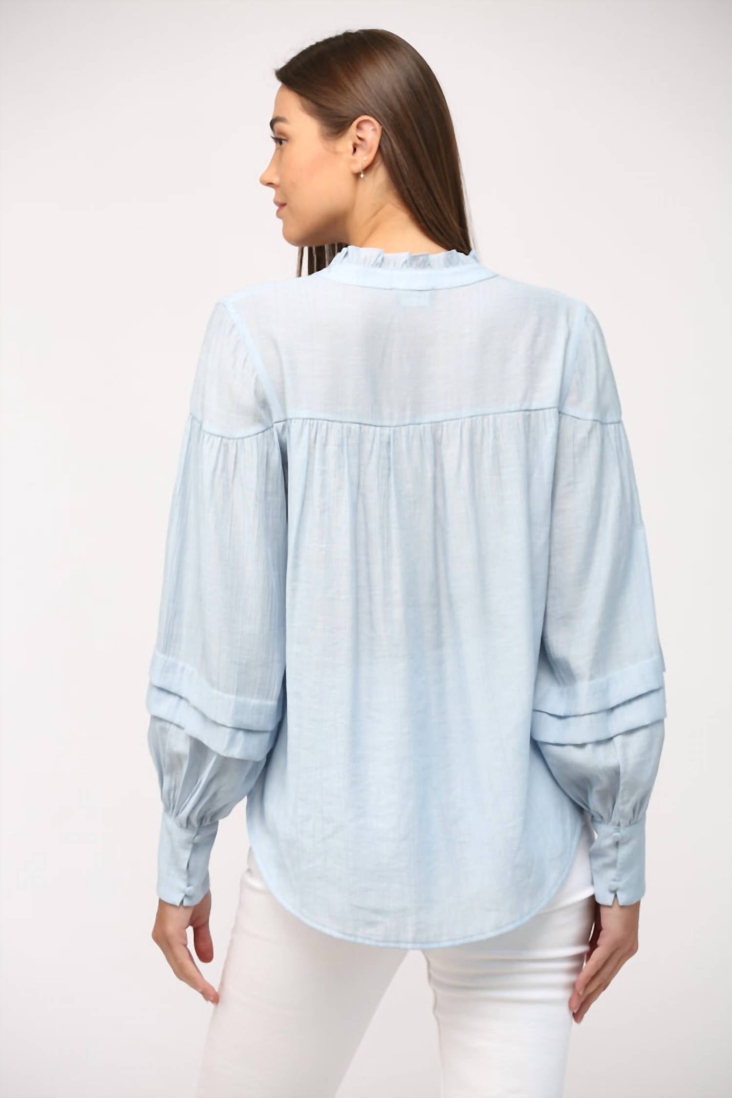 Идеальное сочетание комфорта и стиля в завораживающем нежно-голубом оттенке. Изготовлено из 85% вискозы и 15% полиэстера. Однотонный топ с V-образным вырезом и элегантными длинными рукавами. Завязывается на завязку. Гарантирует, что вы будете выделяться без усилий.