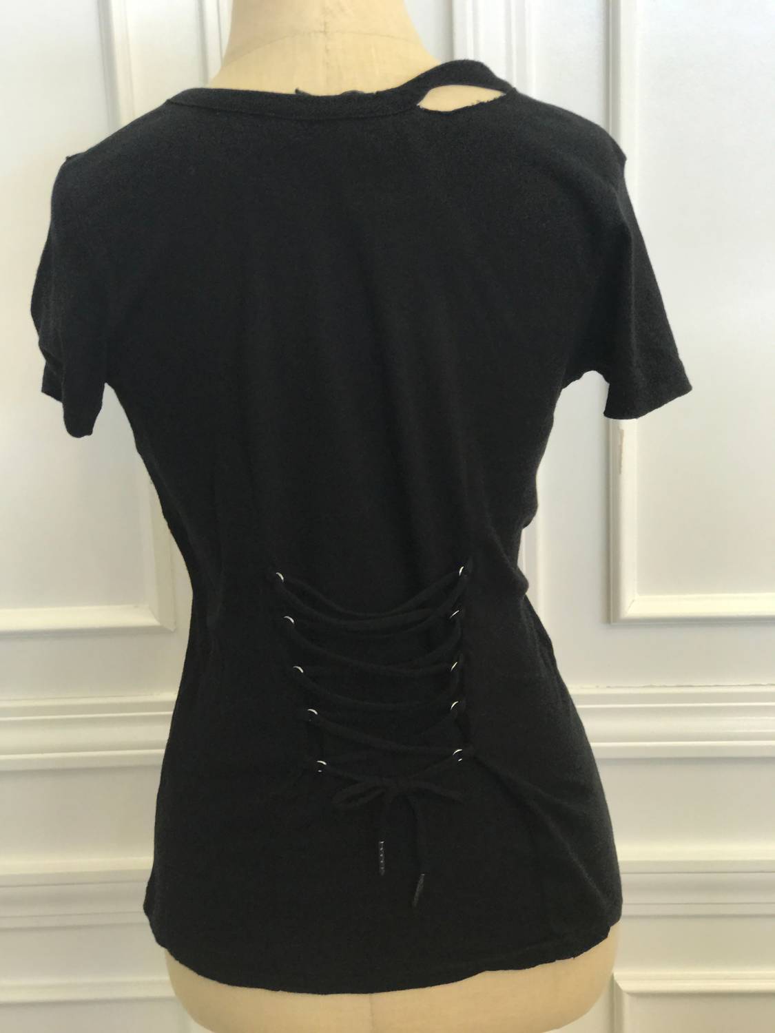 Круглый вырез. Короткие рукава. Шнуровка сзади.