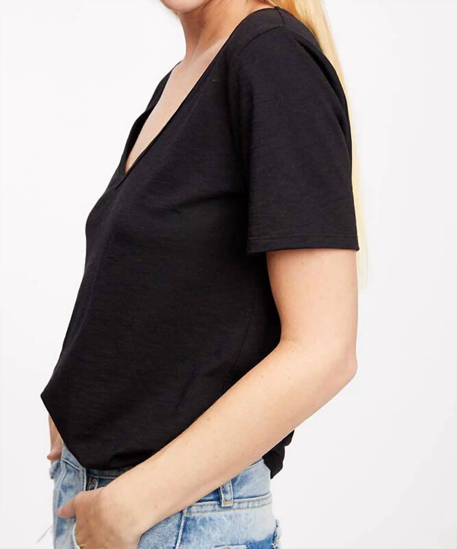 Классическая футболка с V-образным вырезом и коротким рукавом. Состав: 50% хлопок, 50% модал. Параметры модели: рост 5 футов 8 дюймов, бюст 34, талия 26, бедра 36. На модели размер small.
