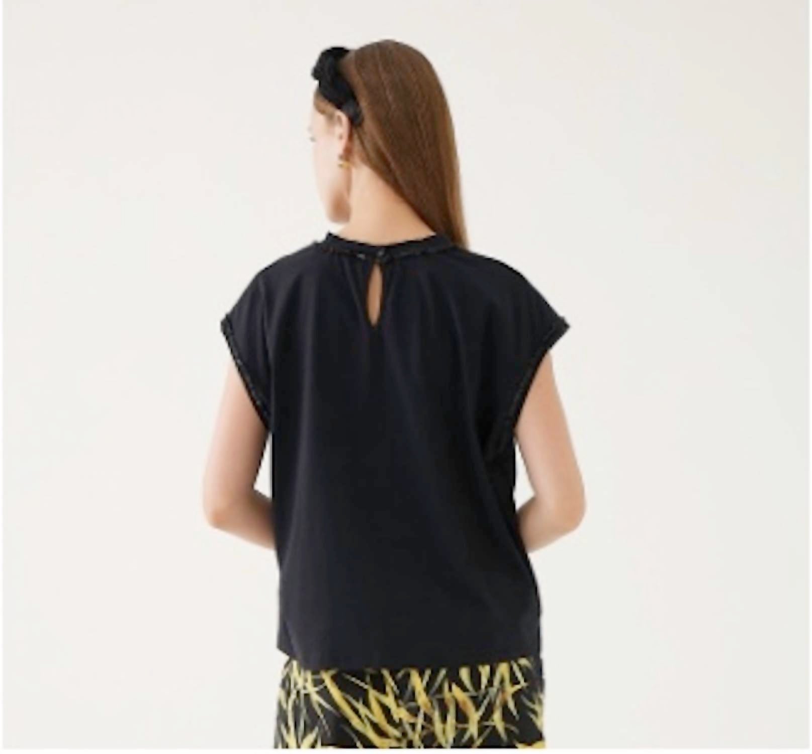 Эта симпатичная черная футболка с круглым вырезом украшена бусинами сзади, которые придают ей достаточно блеска, чтобы сделать ее особенной.