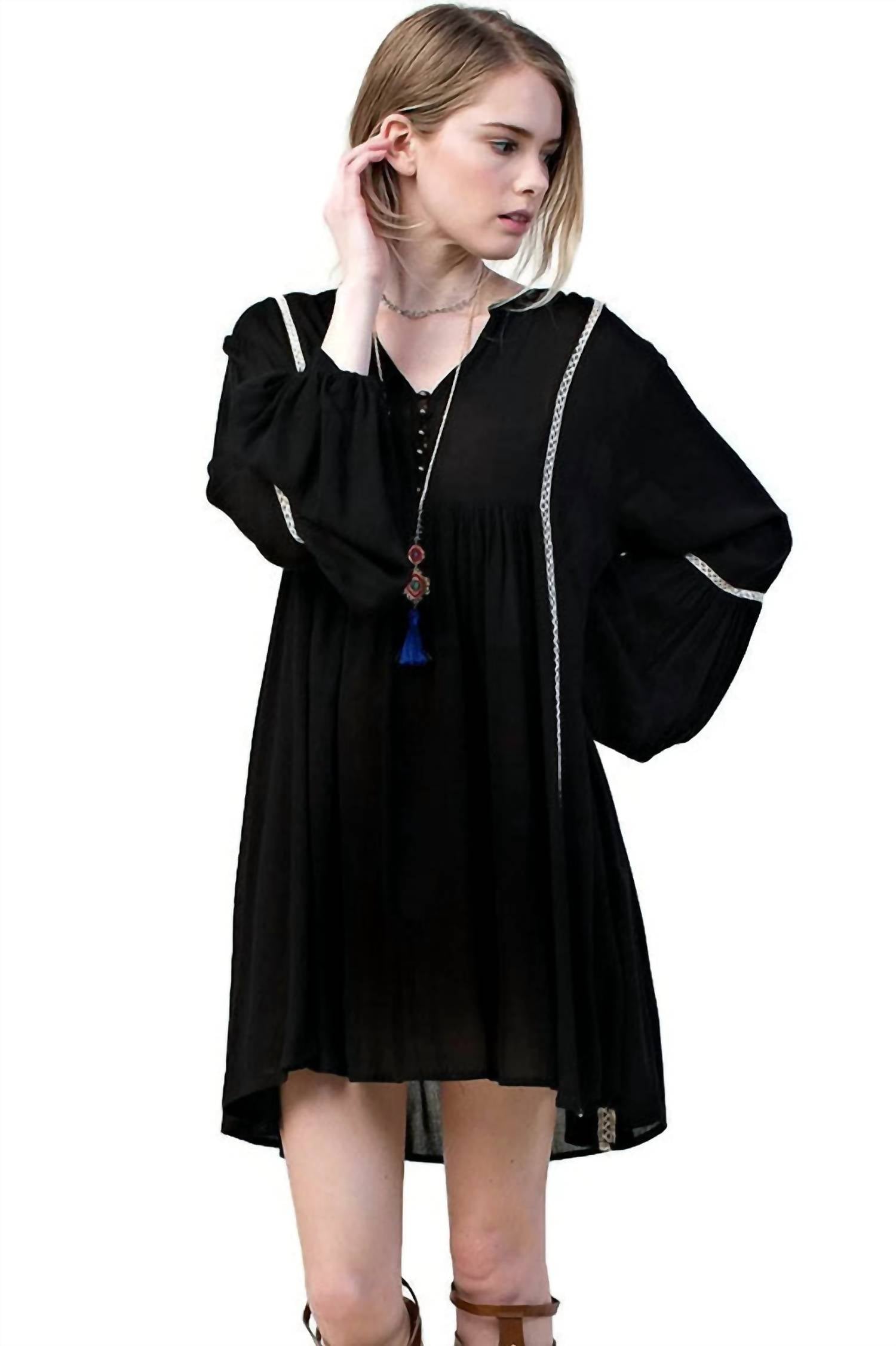 V-образный вырез с пуговицами. Длинные рукава на резинке. Кружевная отделка на теле и рукавах. Высокий-низкий подол. Свободный А-силуэт мини. Маленькая грудь 38 дюймов длина 31 дюйм. Средняя грудь 40 дюймов длина 31 дюйм. Большая грудь 42 дюйма длина 31 дюйм. 100% вискоза. Ручная стирка в холодной воде. Импортируется.