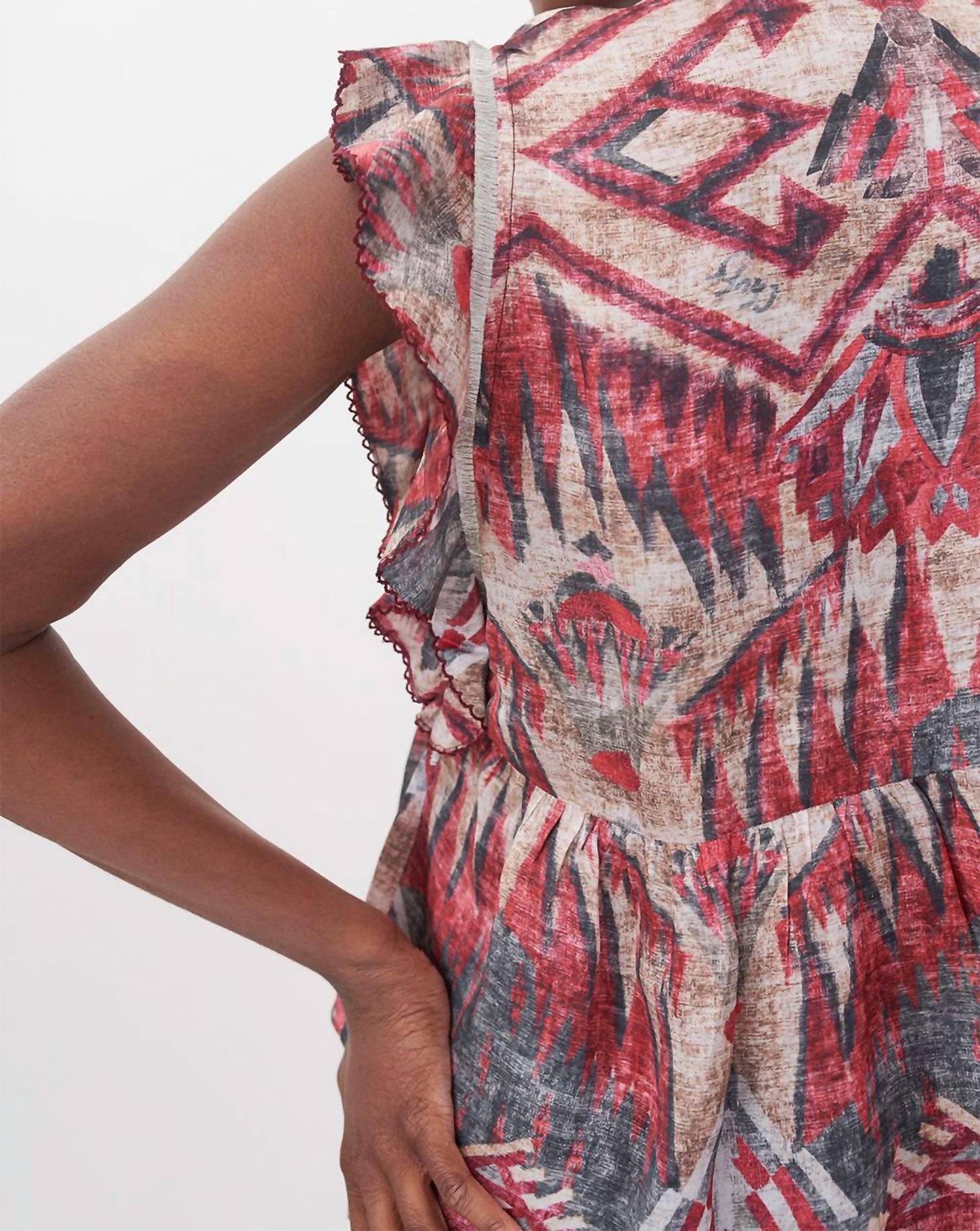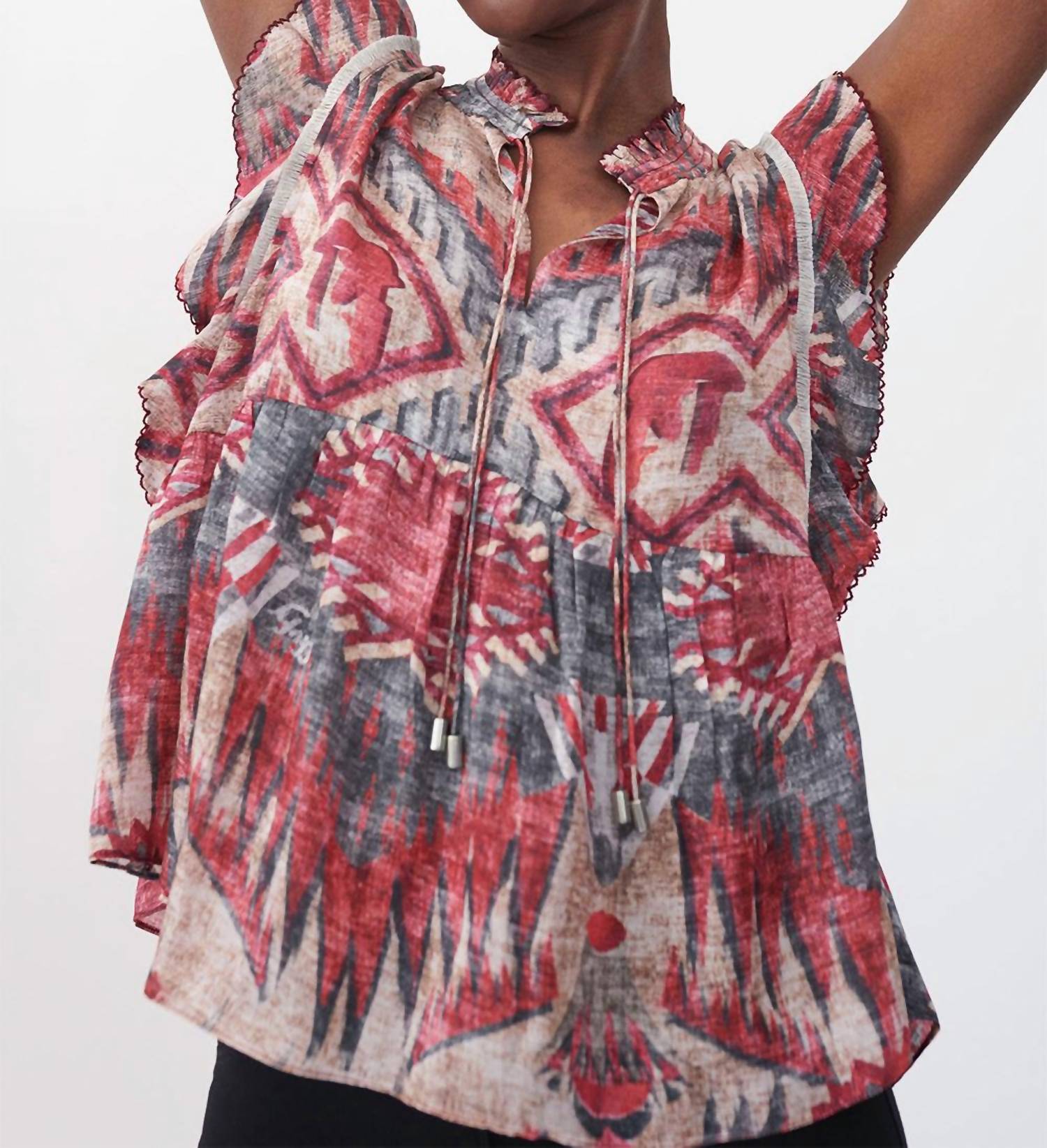 Этот топ Ellis имеет присборенное и свободное тело, которое сочетается с романтическими оборками на рукавах. Он имеет декоративные строчки, серебряную бахрому на проймах и два набора завязок с металлическими наконечниками на вырезе. Состав - 80% хлопок, 20% шелк. Посадка - точно по размеру.
