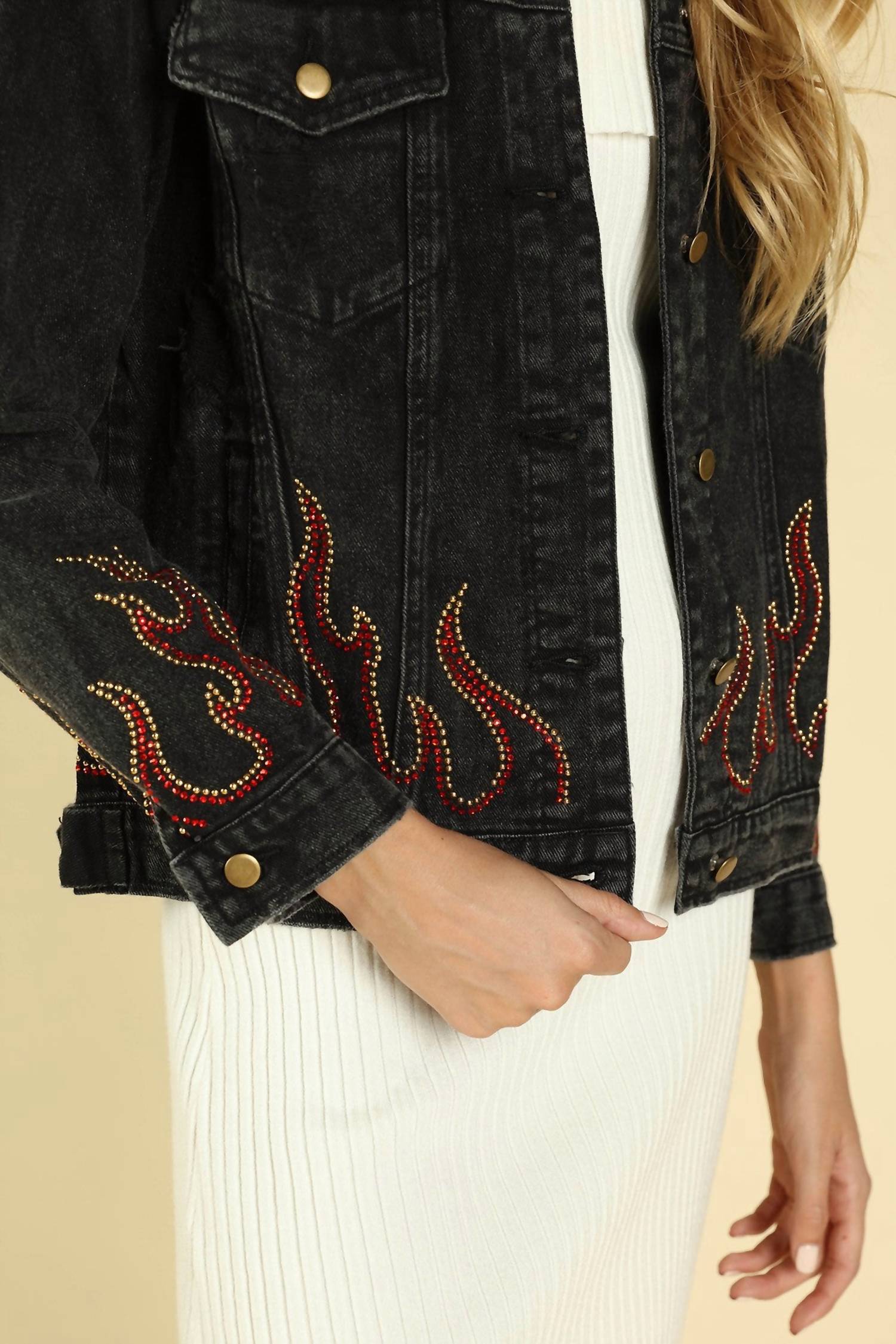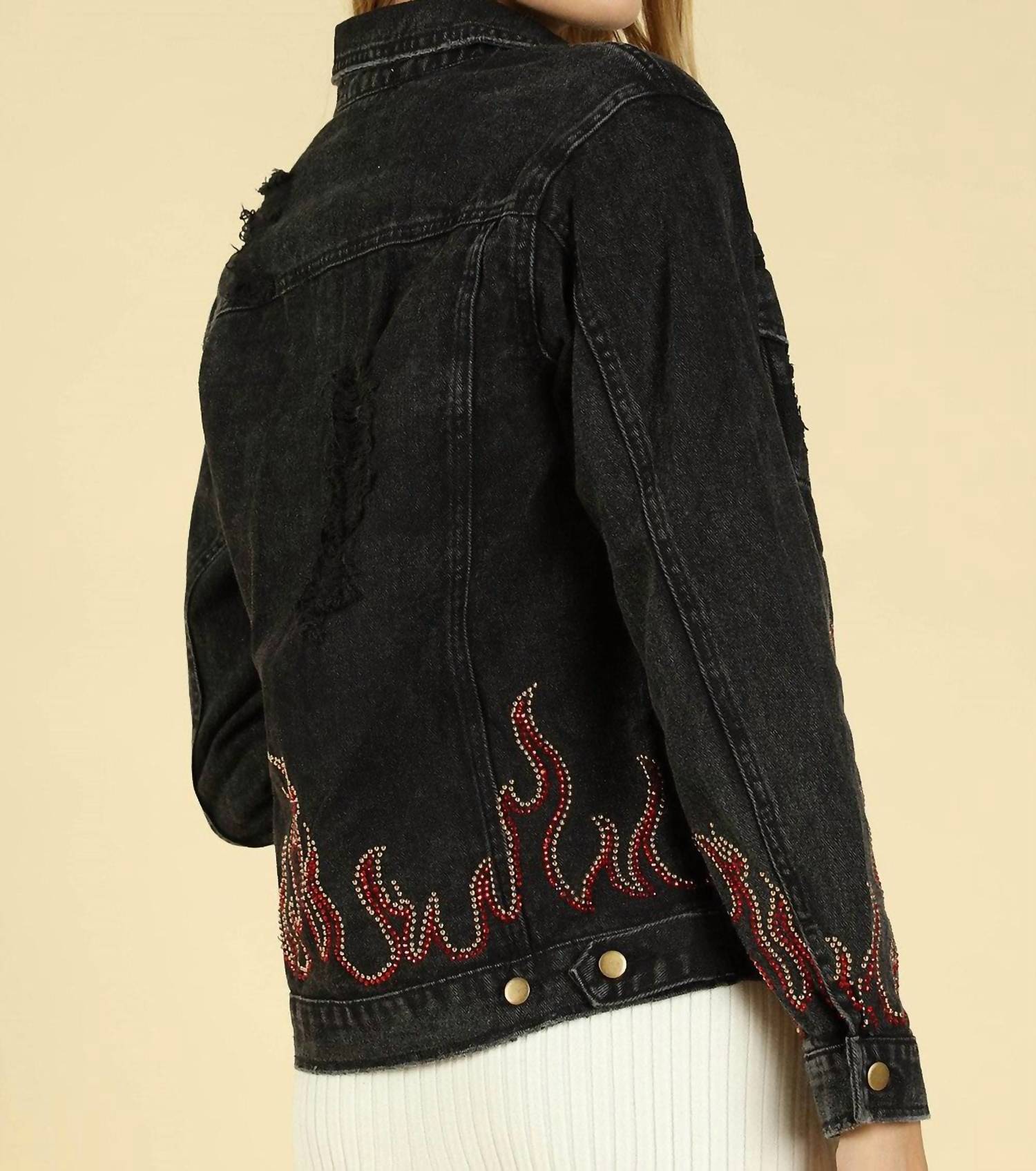 Это классический жакет с изюминкой. Классический воротник, застежка на пуговицы спереди, четыре кармана, длинные рукава, потертые детали и стразы в виде пламени. Маленькая грудь 38" Длина 23", Средняя грудь 40" Длина 23", Большая грудь 42" Длина 23". 100% хлопок.