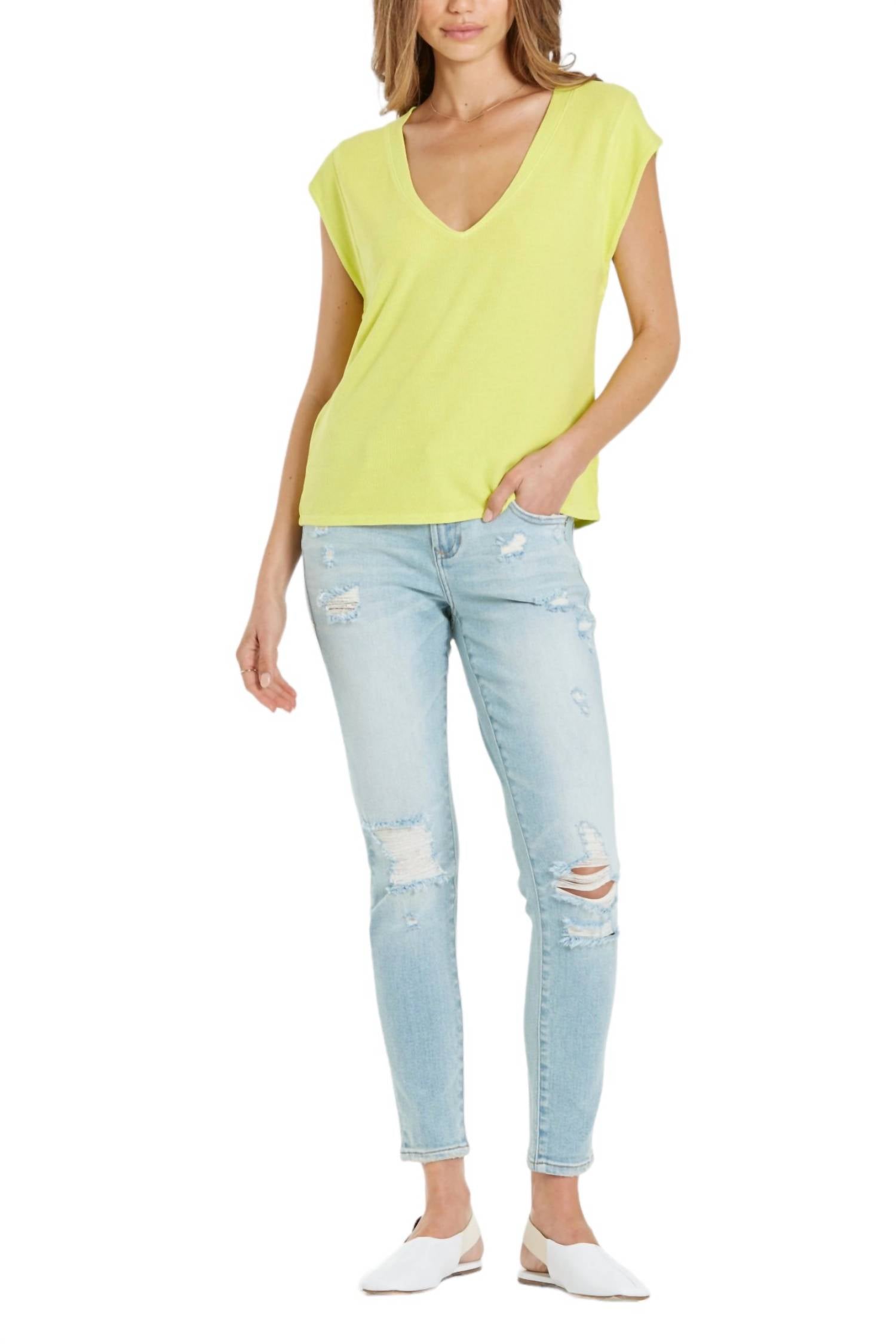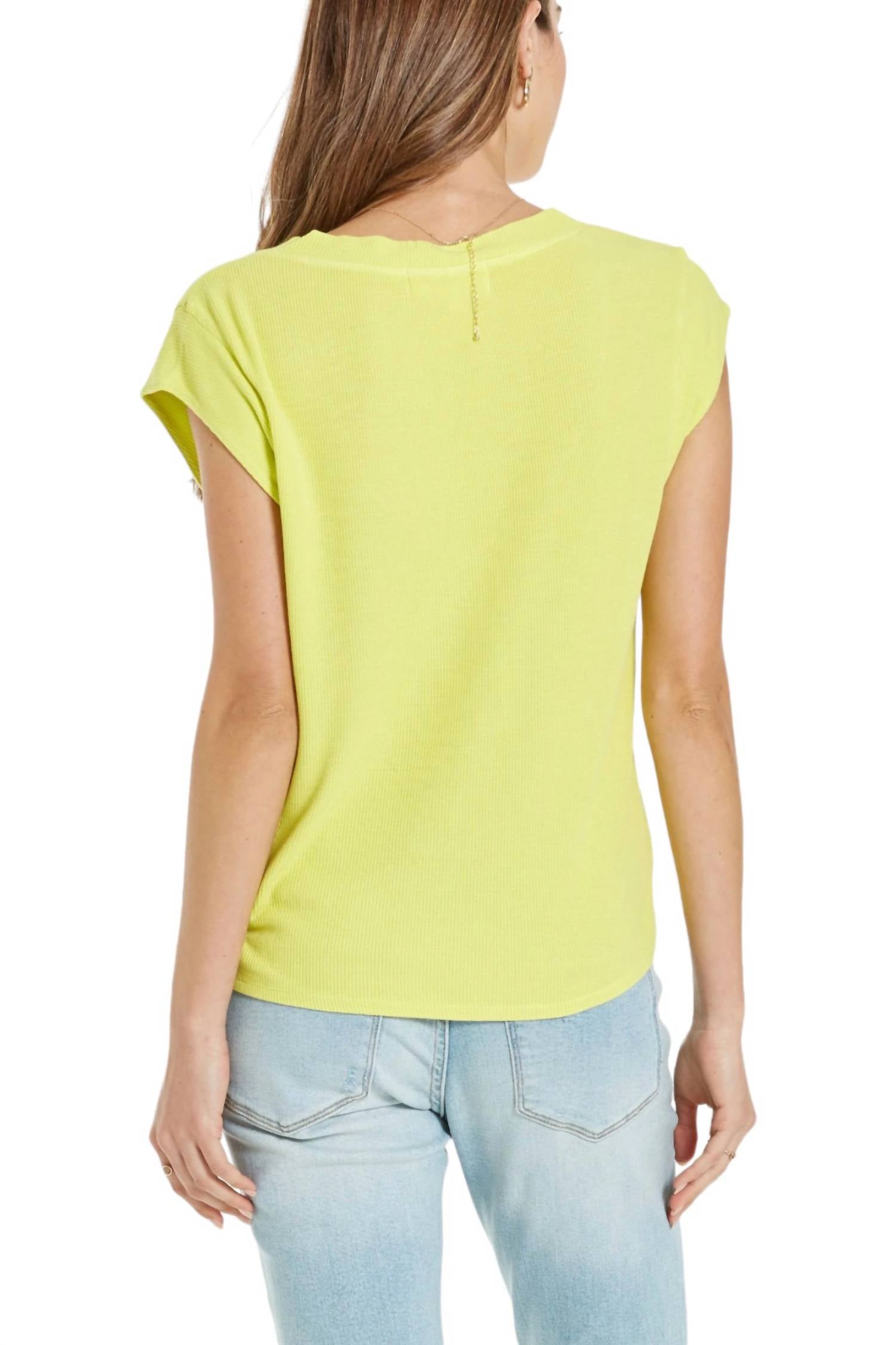 Этот топ из вискозы с V-образным вырезом имеет рукав-крылышко и резинку на шее и рукавах. Однотонный трикотаж, стандартный крой. 95% вискозы и 5% спандекса. Длина изделия от HPS - 23", высота манжеты - 2 1/2", обхват груди - 35" (размер Small). Ручная стирка в холодной воде, сушка на горизонтальной поверхности.