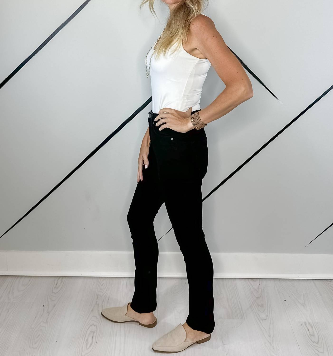 Эластичный деним обеспечивает комфорт и гибкость, позволяя носить полноценные джинсы без обтягивания, как у джеггинсов, и дополняется классическим прямым кроем.