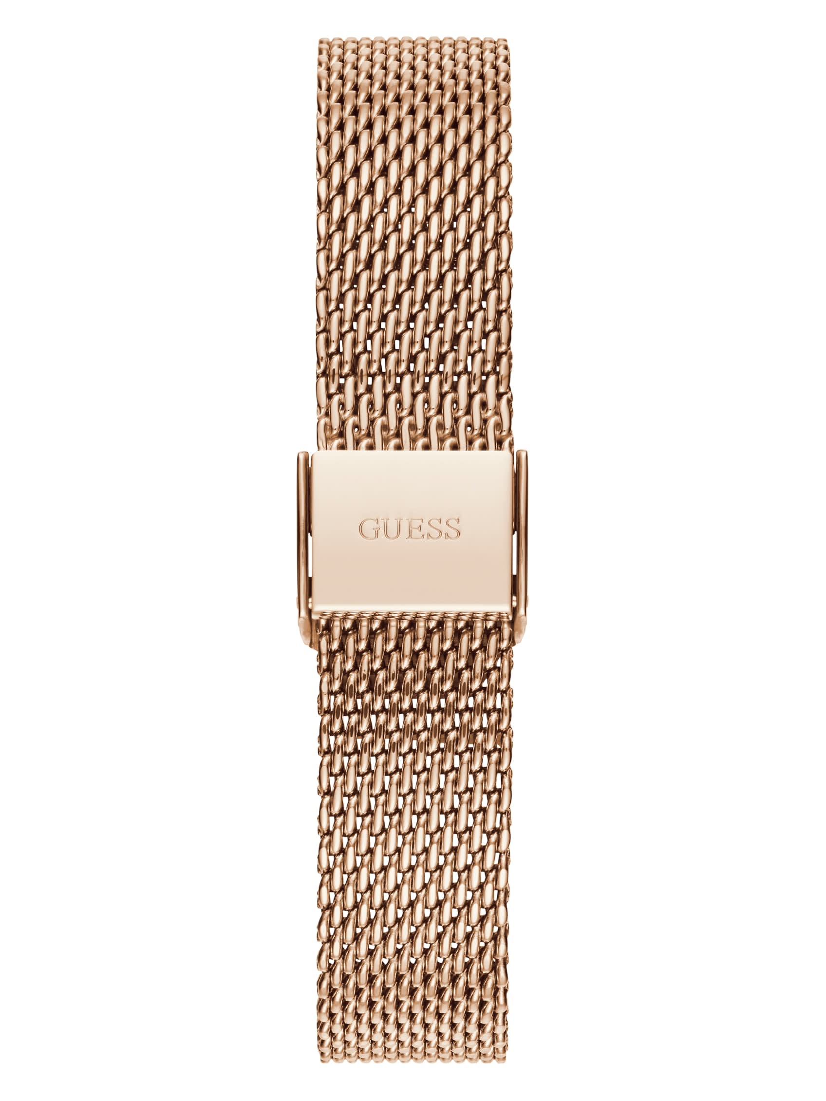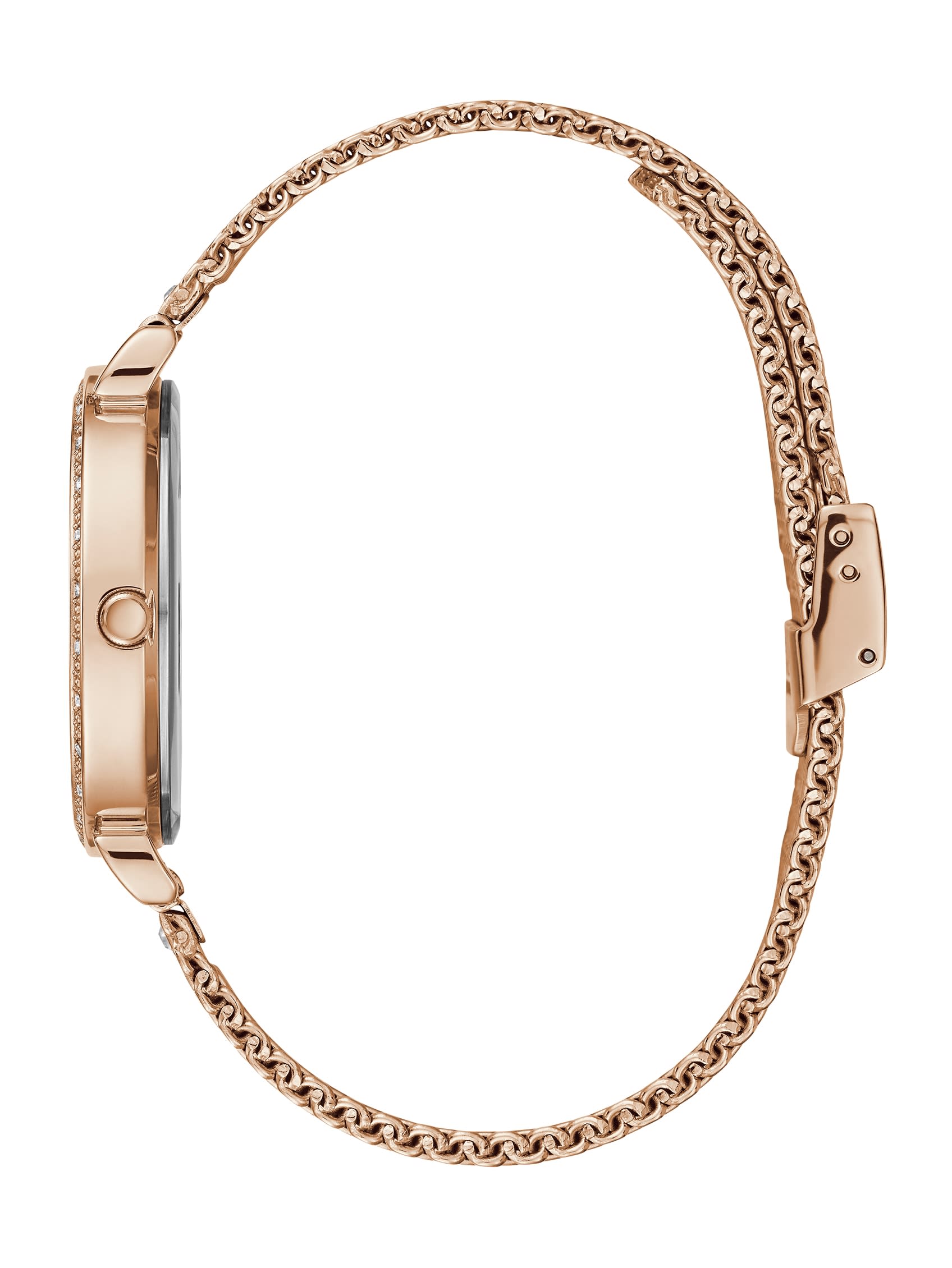Эти классические аналоговые часы, дополненные сетчатым цепочным ремешком, будут элегантно смотреться и днем, и ночью. Цвет розового золота, безель украшен кристаллами.