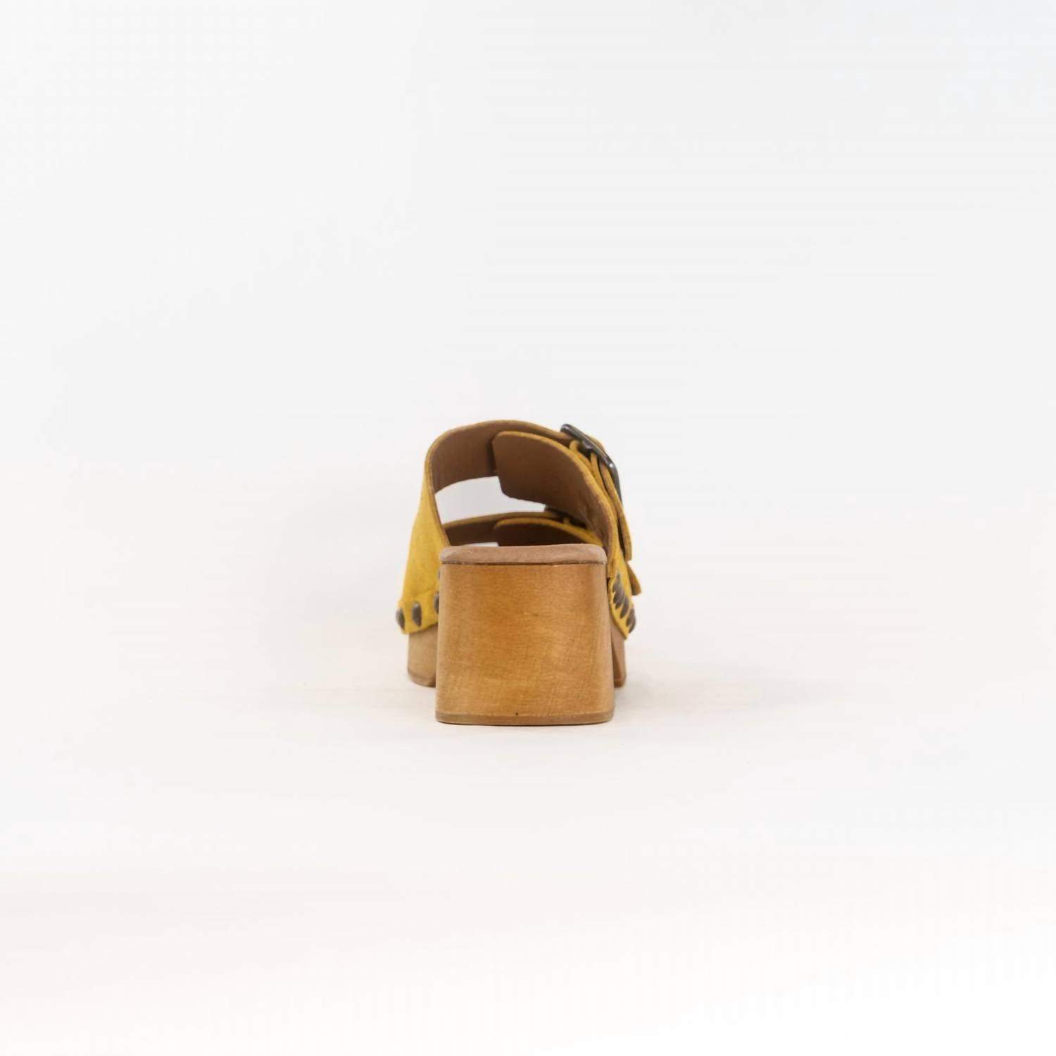 Мюли с открытым носком. Два широких ремешка. Большая квадратная пряжка. Мягкие ремешки. Толстая деревянная подошва. Каблук Bock, также деревянный.
