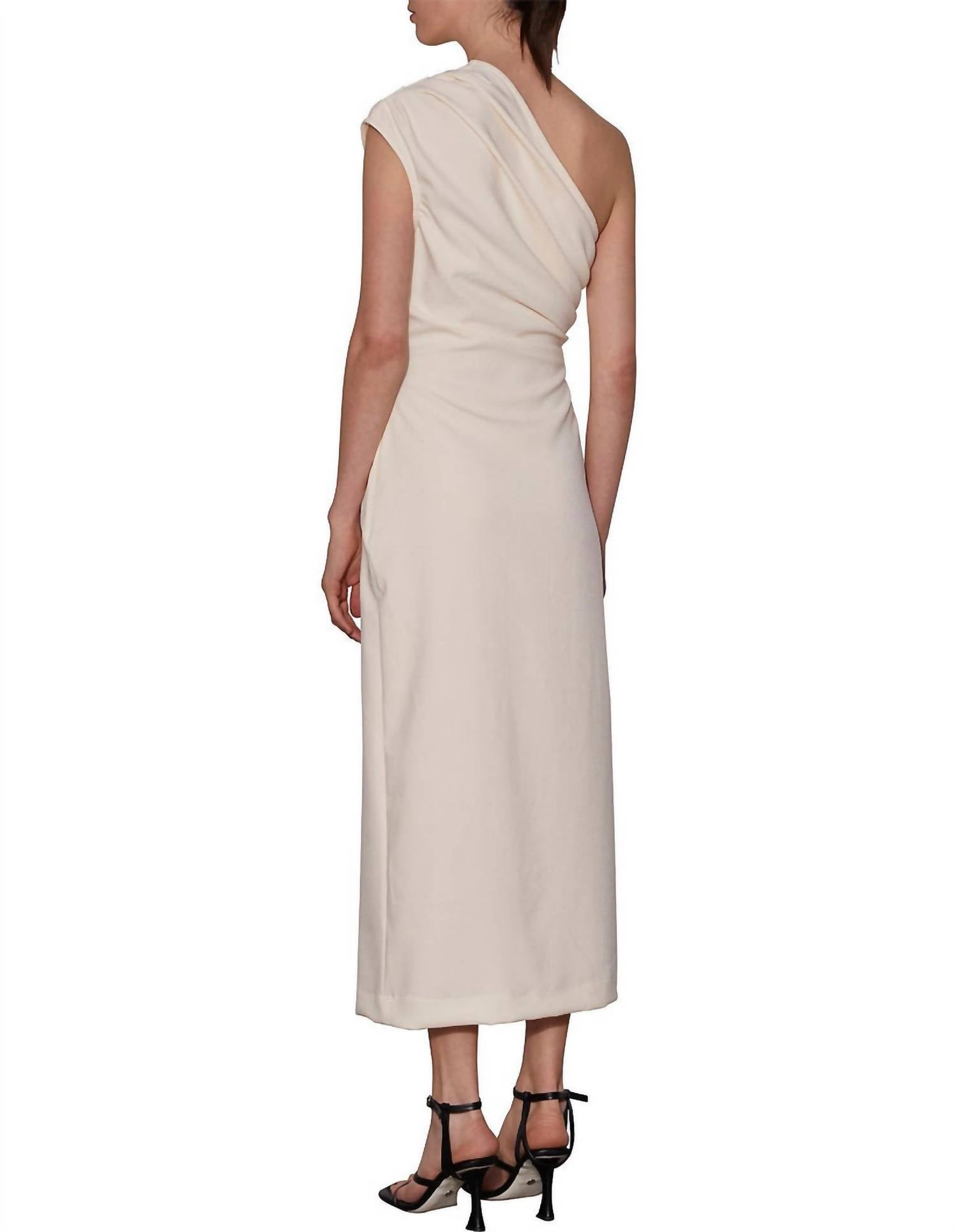 Платье Ruby One Shoulder Dress — это фиксированное макси-платье с вытачками на плече и талии для придания формы. Оно имеет невидимую застежку-молнию, обтачку горловины и проймы, а также потайную отделку подола. Ткань немного тянется и состоит из 62% полиэстера, 34% вискозы и 4% спандекса. Соответствует размеру.