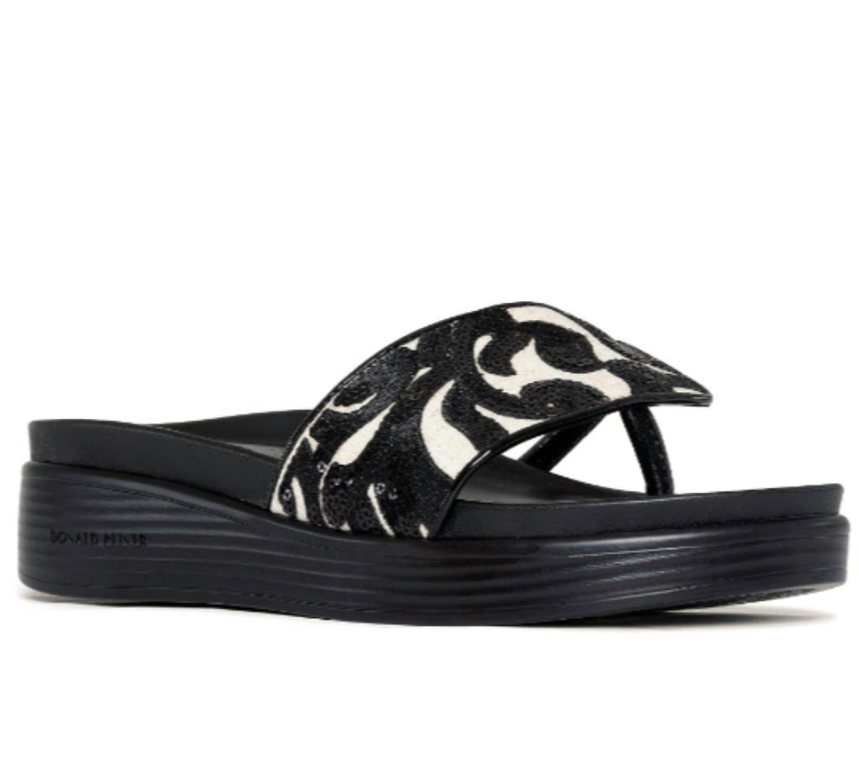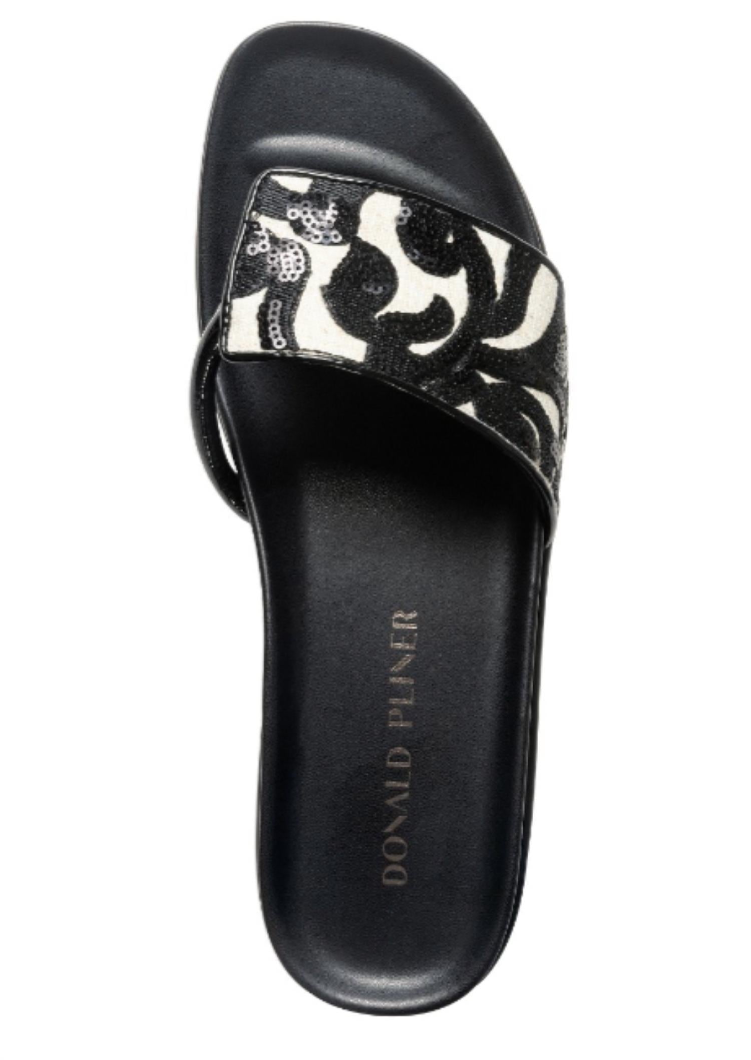 Сандалии FIFI от Дональда Плинера. Самые продаваемые. Удобная формованная стелька с дополнительной подкладкой. Однополосный слайдер. Верх из парчи. Низ из резины. Тонкий подносок. Круглый носок. Натуральный с черной парчой.