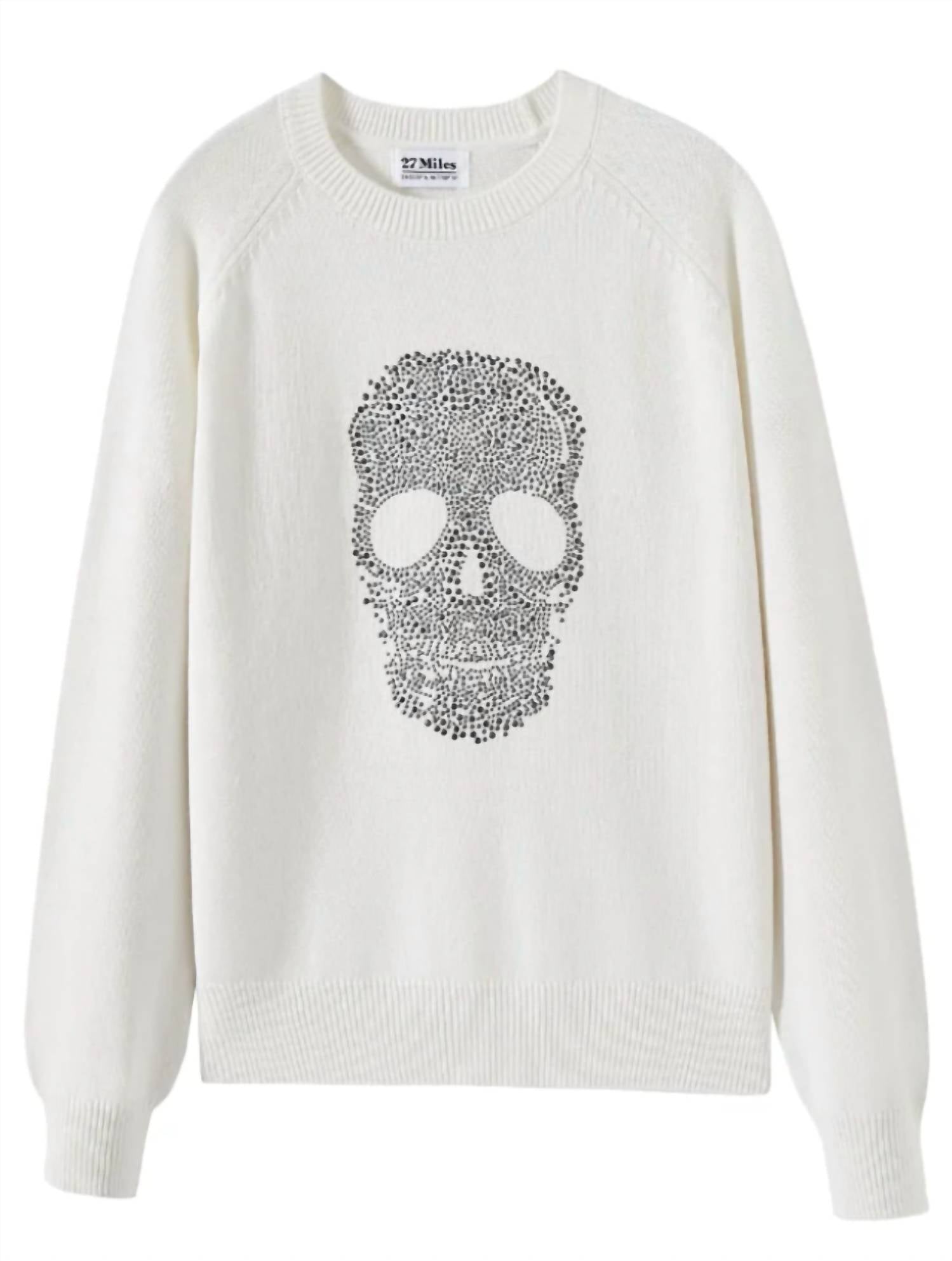 Лучший свитер, искусно созданный, чтобы обеспечить идеальное сочетание тепла и стиля. Классический дизайн и мягкая ткань делают его обязательным дополнением к вашему гардеробу. Белоснежный хлопковый кашемировый свободный свитер реглан с матовым черепом из стразов. 95% кашемира/5% хлопка Ручная стирка в холодной воде/сушить на горизонтальной поверхности или химчистка