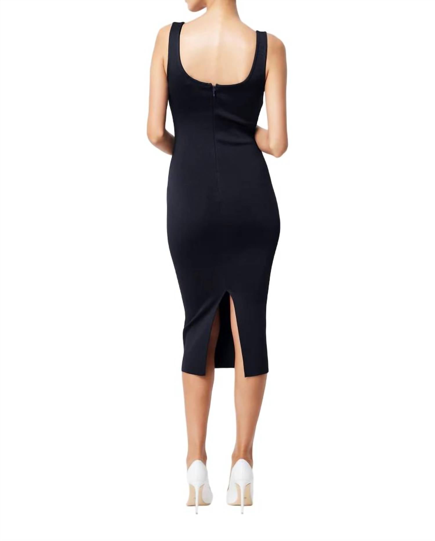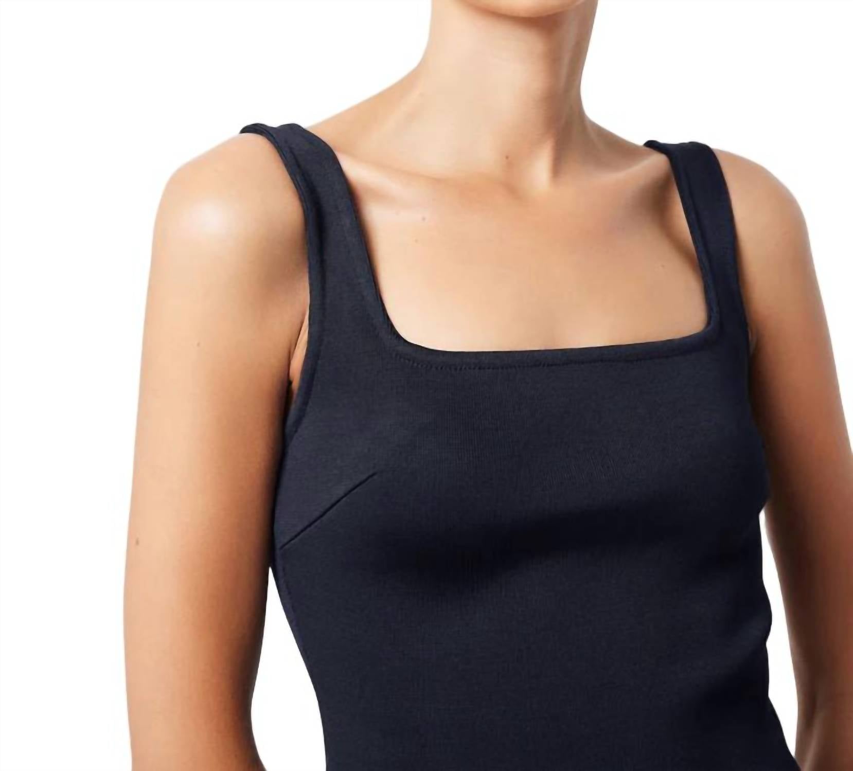 Это платье сочетает в себе облегающую посадку и роскошный комфорт высококачественного крепового трикотажа. Оно имеет приталенный силуэт, квадратный вырез, толстые бретели и безрукавный дизайн. Платье имеет длину миди с центральной молнией сзади. Изготовлено из 65% вискозы и 35% нейлона.