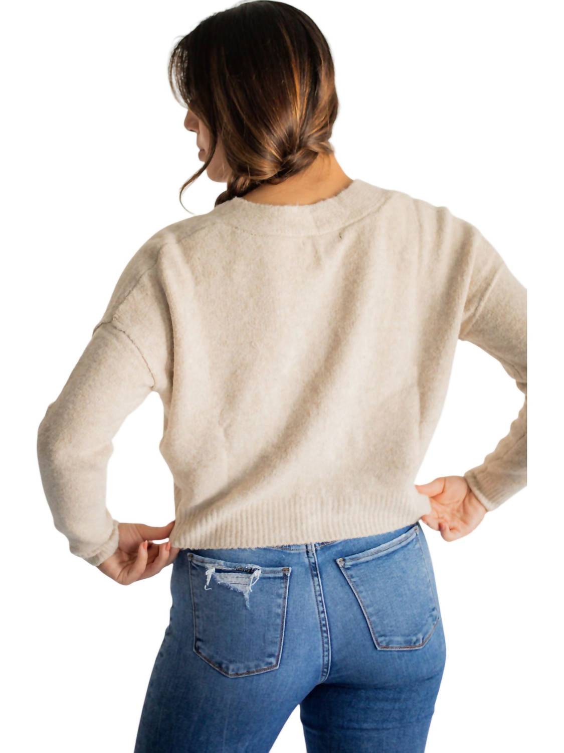 Легкий свитер с V-образным вырезом. Мягкая, удобная ткань, идеальная длина. Немного свободный крой, размер в размер. 56% полиэстер, 38% нейлон, 6% спандекс.