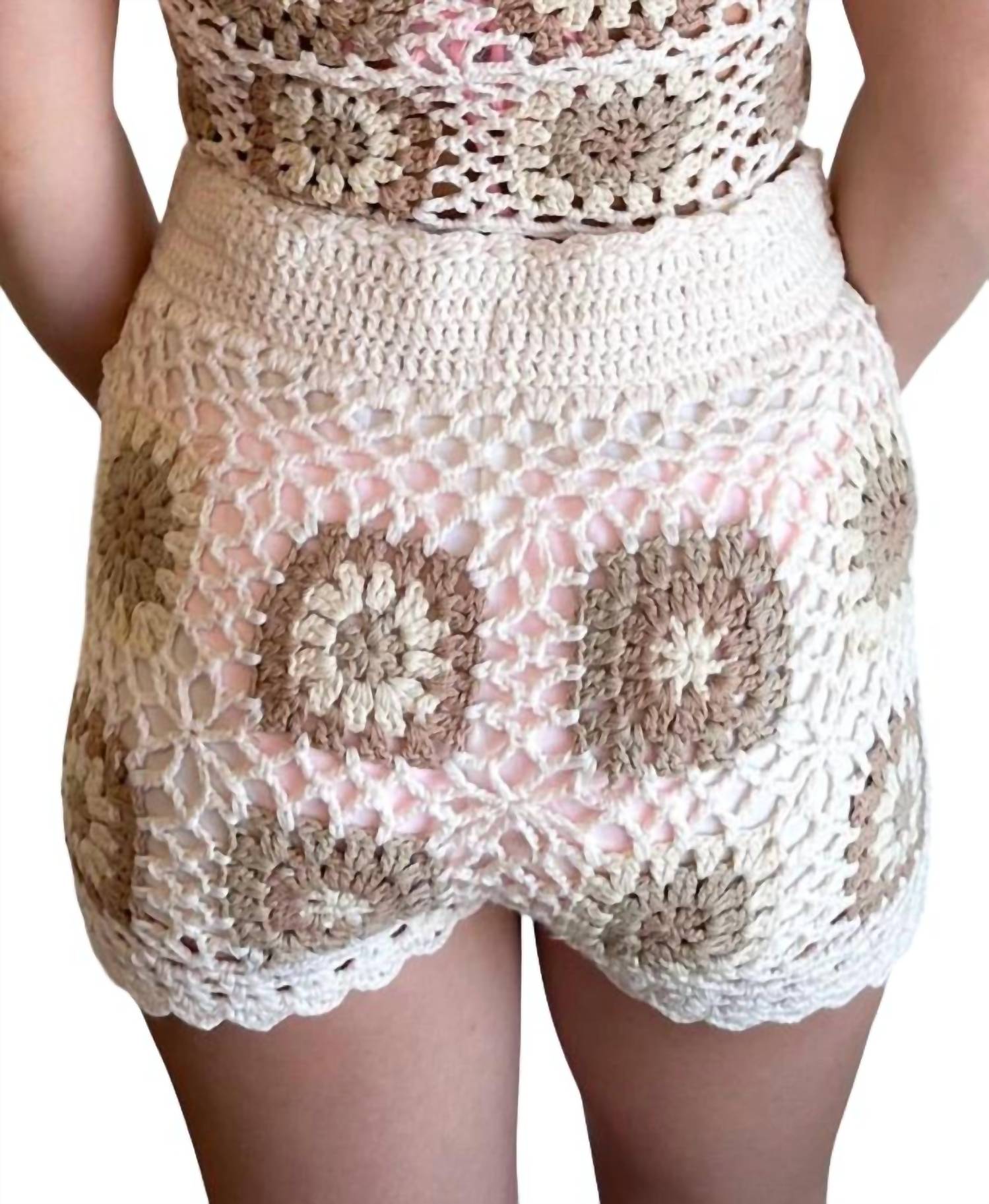 Вязаные шорты со сложной отделкой и свободным кроем. Изготовлены из 60% хлопка и 40% акрила. Ручная стирка в холодной воде и сушка на веревке. У модели бедра 30 дюймов, талия 24 дюйма, размер small.