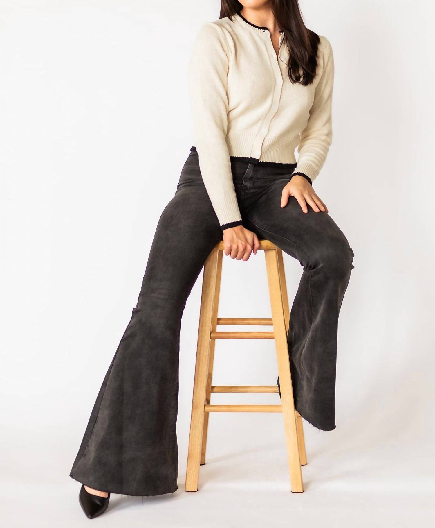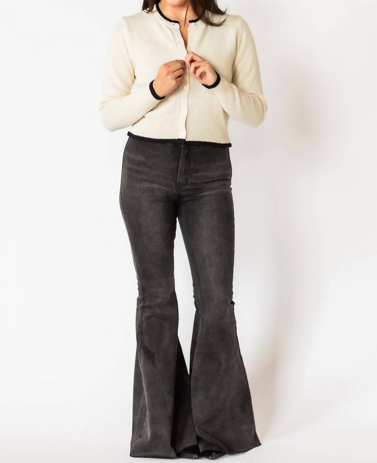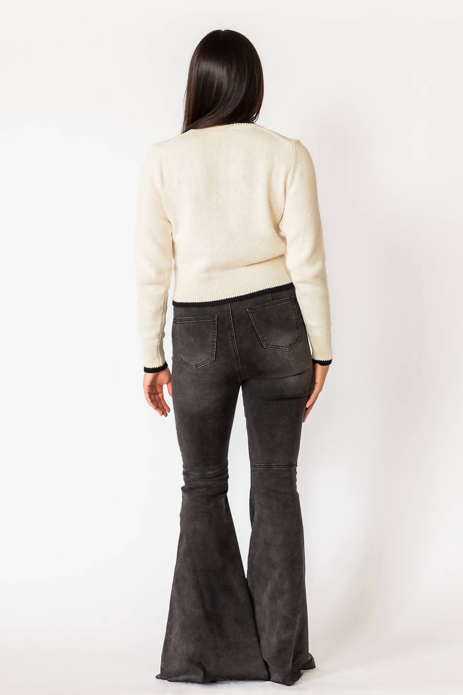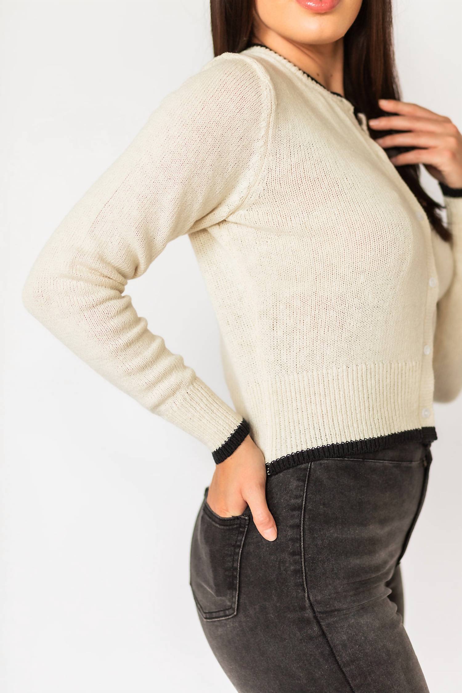 Свитер с длинными рукавами. Круглый вырез. Застежка на пуговицы. 35% шерсть, 15% акрил, 50% нейлон. Черная отделка. Цвет - белый. Мягкий и универсальный. Всегда актуальный фасон.