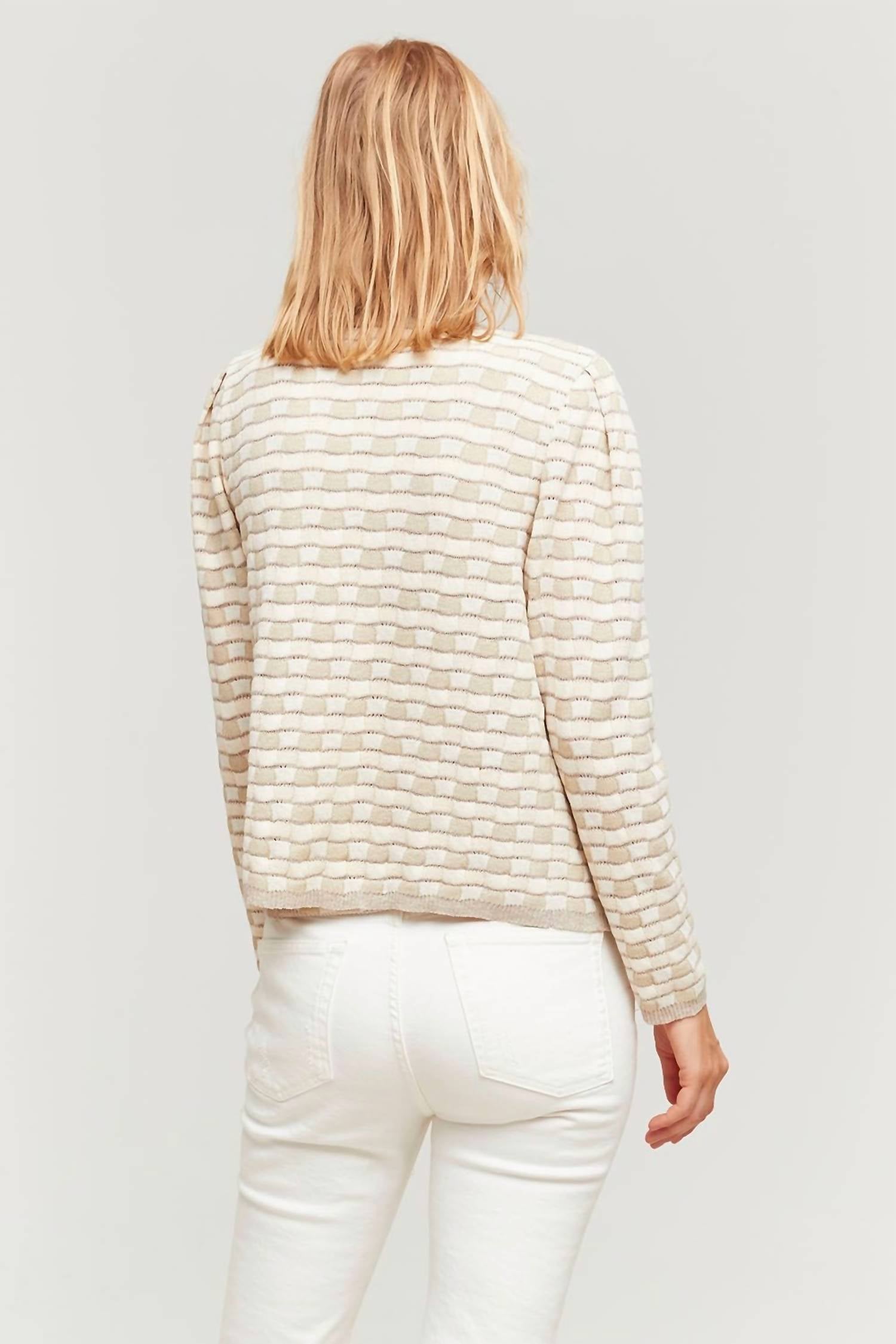 Классический клетчатый пиджак с открытыми передними пуговицами. Изготовленный из смеси хлопка, переработанного полиэстера и вискозы, этот свитер мягко облегает тело, обеспечивая комфортную посадку.