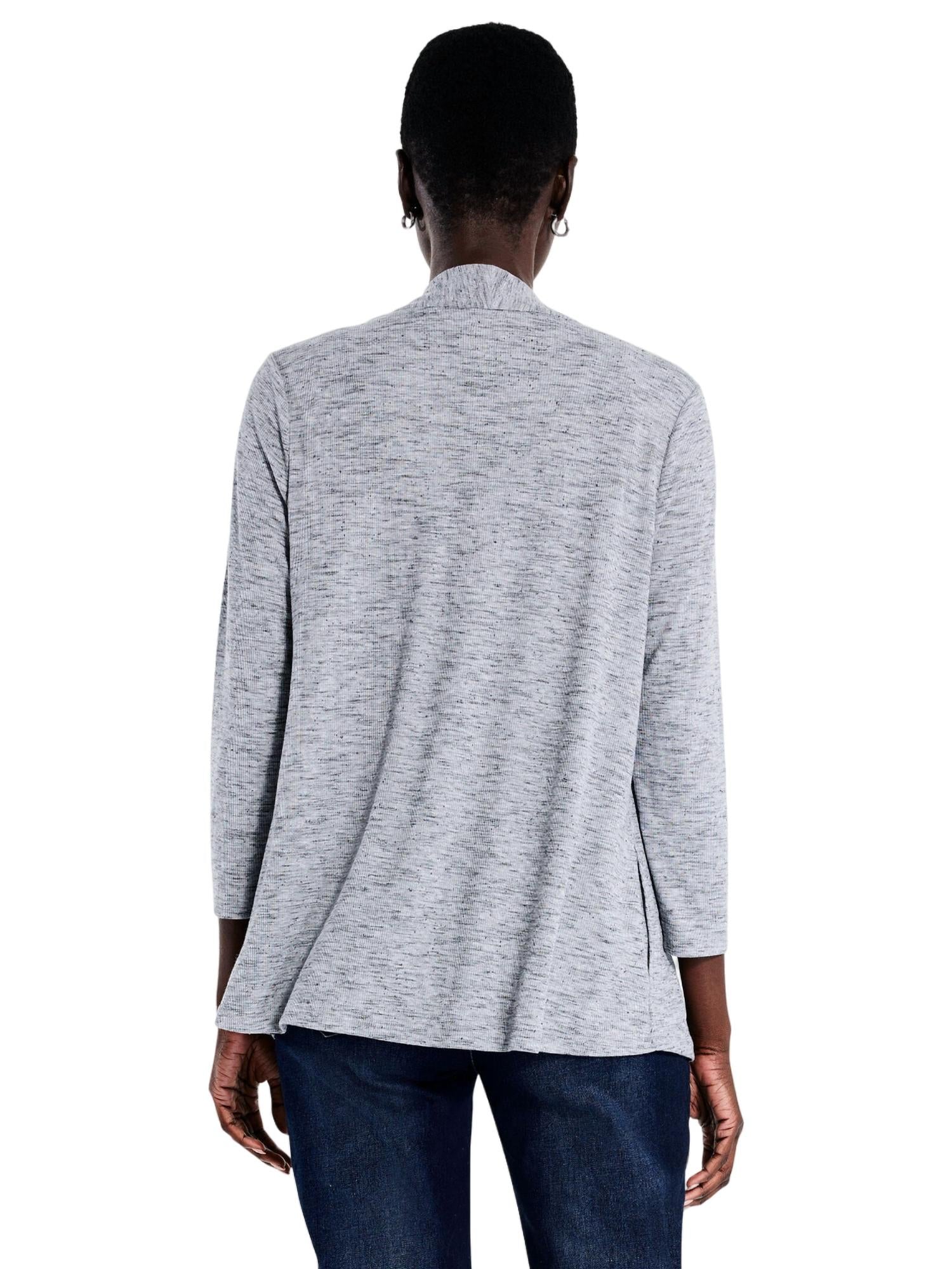 Рубчик. Средняя плотность. Свободный крой. Воротник-шалка. Рукав 3/4. Базовый рукав. Открытый перед. Посадка на уровне бедра. Длина 26 1/2 дюйма. Машинная стирка в холодной воде. 67% полиэстер, 28% вискоза, 5% спандекс.