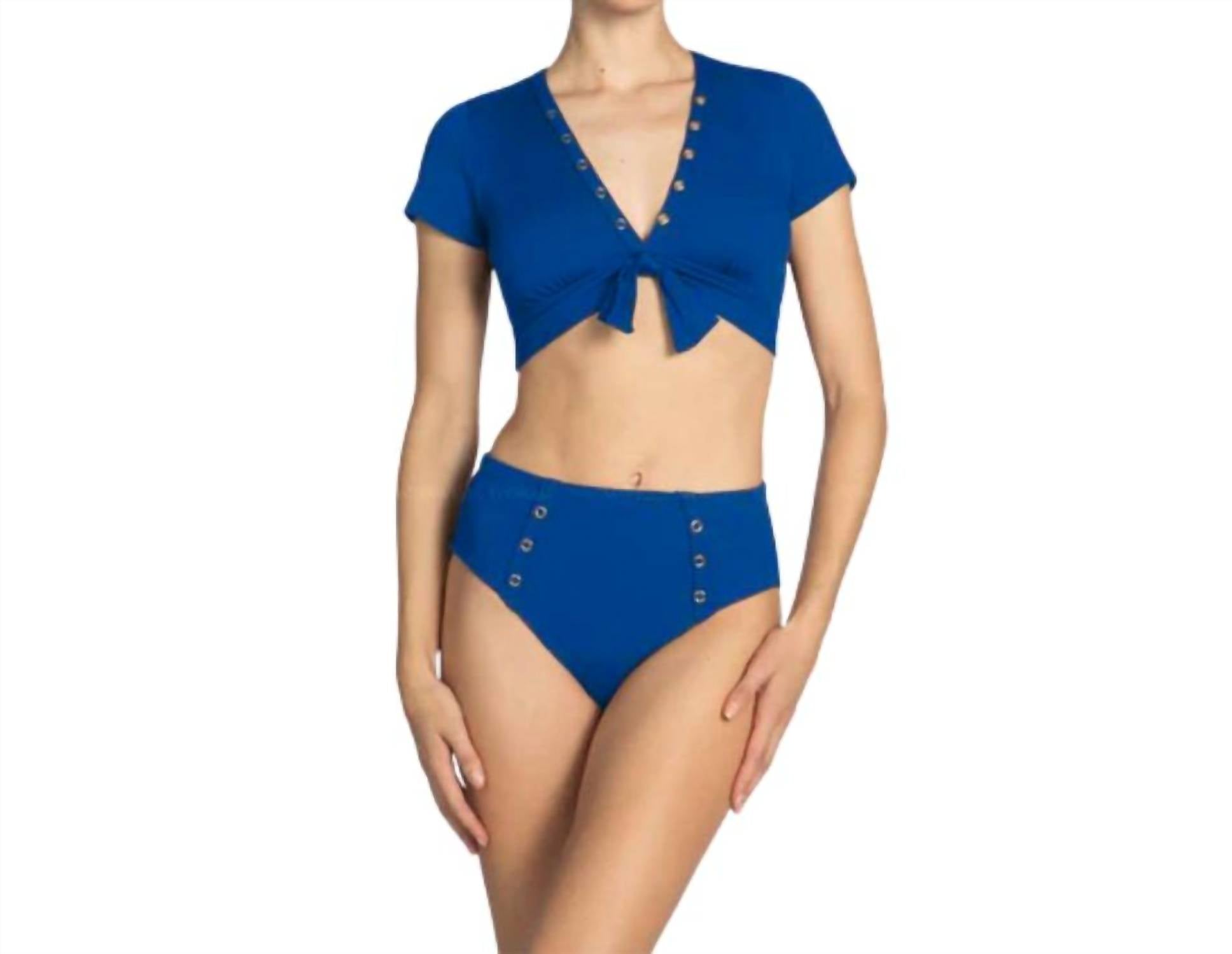 Высокая талия с деталями на кнопках. Умеренная степень защиты. Ручная стирка. 92% нейлон, 8% спандекс.