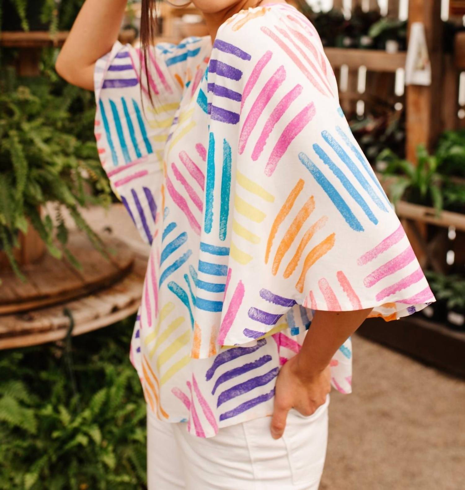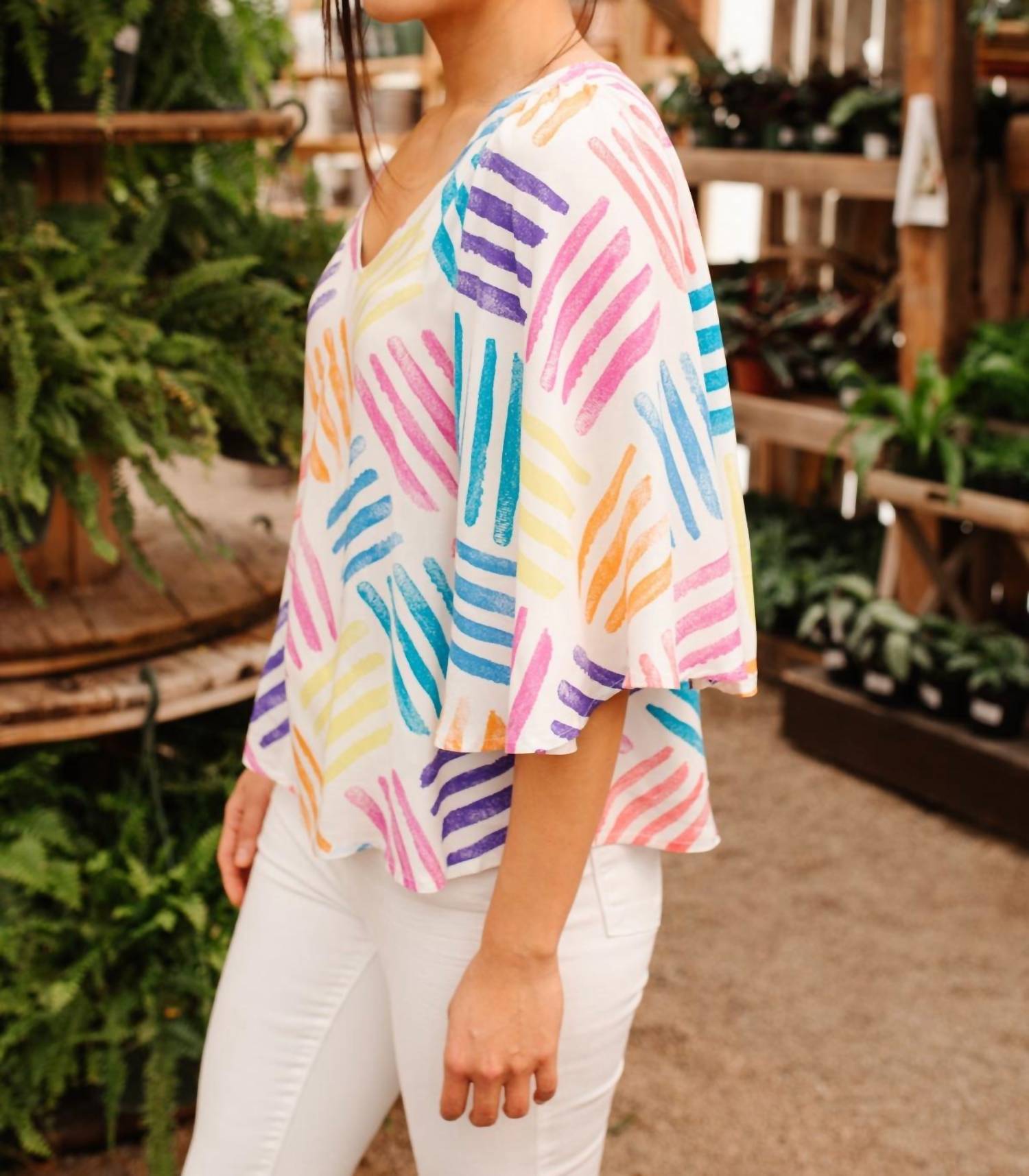 Свободный лиф. V-образный вырез, рукава три четверти. Принт из трех полосок розового, оранжевого, синего и желтого цветов. Легкое. V-образный вырез. Укороченный расклешенный рукав. 100% вискоза. Стирать в холодной воде, сушить в подвешенном состоянии. Соответствует размеру, материал практически не тянется.