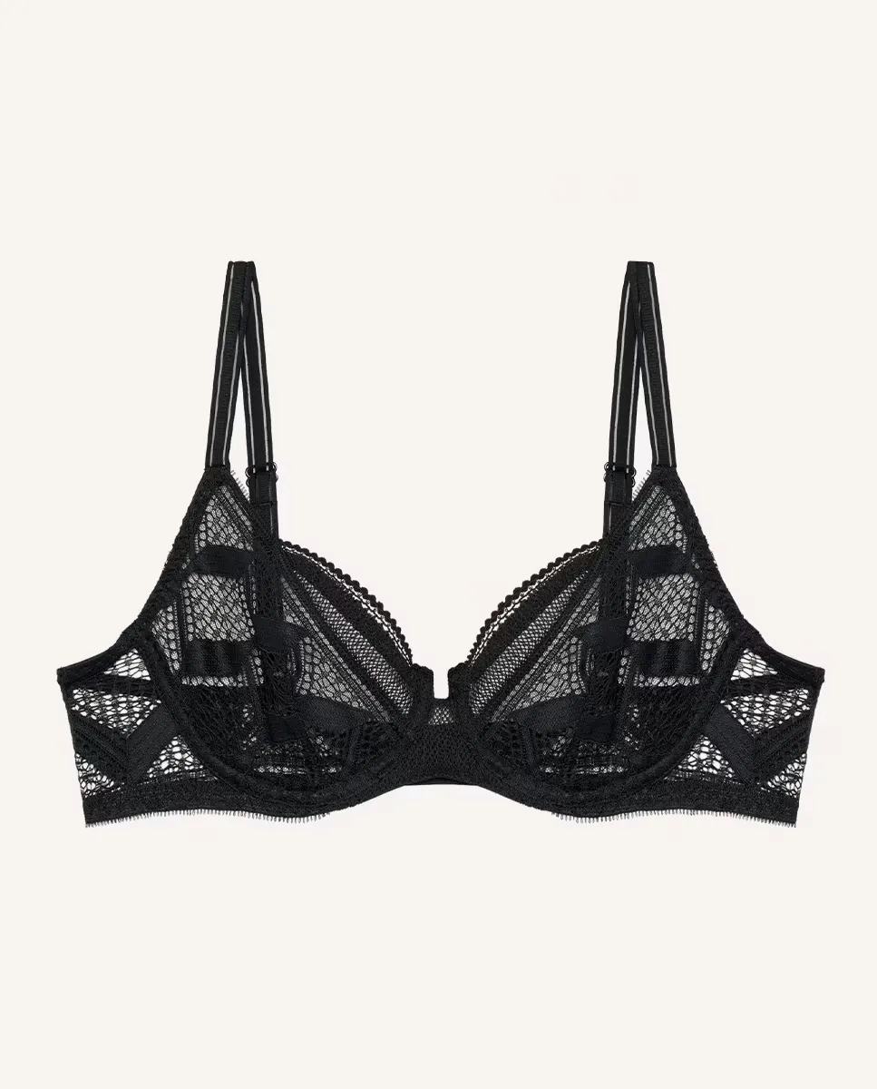 Вместительный бюстгальтер на косточках с половиной чашки из геометрического кружева для повседневного ношения, сочетающий в себе комфорт, поддержку и женственность. Чашки с подкладкой из тюля для обеспечения максимальной поддержки и комфорта. Спинка из кружева усилена фатином. Регулируемые лямки по всей длине. Коллекция Signature.