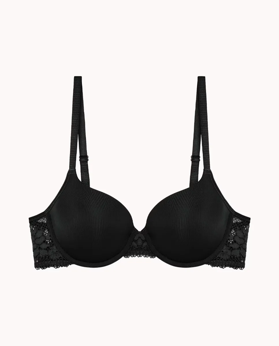 Бюстгальтер на косточках с чашками на легкой подкладке для формирования груди и обеспечения большей поддержки. Спинка и кружевная чашка с рисунком. Регулируемые лямки по всей длине. Коллекция изысканного нижнего белья.