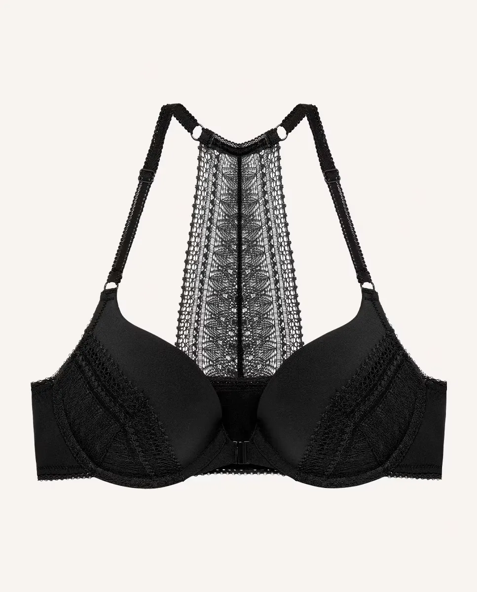 Бюстгальтер пуш-ап на косточках с кружевными деталями на чашечках. Геометрическая кружевная «гоночная» спинка для женственного и комфортного образа. Регулируемые ремни на протяжении всего путешествия. Застежка спереди у чашки. Коллекция изысканного нижнего белья.